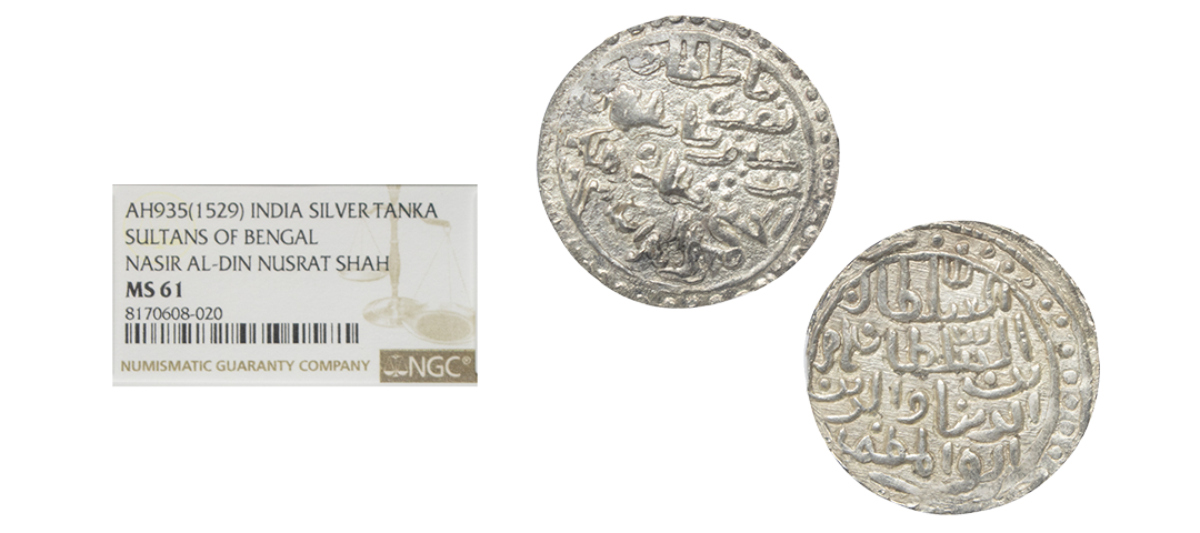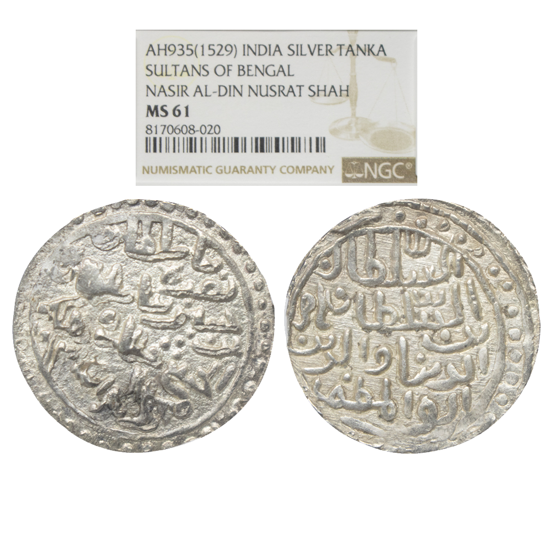 Bengal Sultanate, Nasir Al-Din Nusrat Shah (AH 925-938, 1519-1531 AD), Silver Tanka, Muhammadabad Mint, AH 935, Graded as MS 61 by NGC, G&G # B837, all Bengal sultanate coins in MS grades are rare.