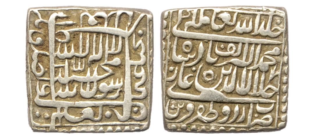 Mughal, Akbar (AH 963-1014, 1556-1605 AD), Silver Square Rupee, 11.33 gms, Urdu Zafar Qarin Mint (fully visible at bottom on obv), AH Alif (1000), KM # 82.8, very fine+, rare in this flan size and grade.