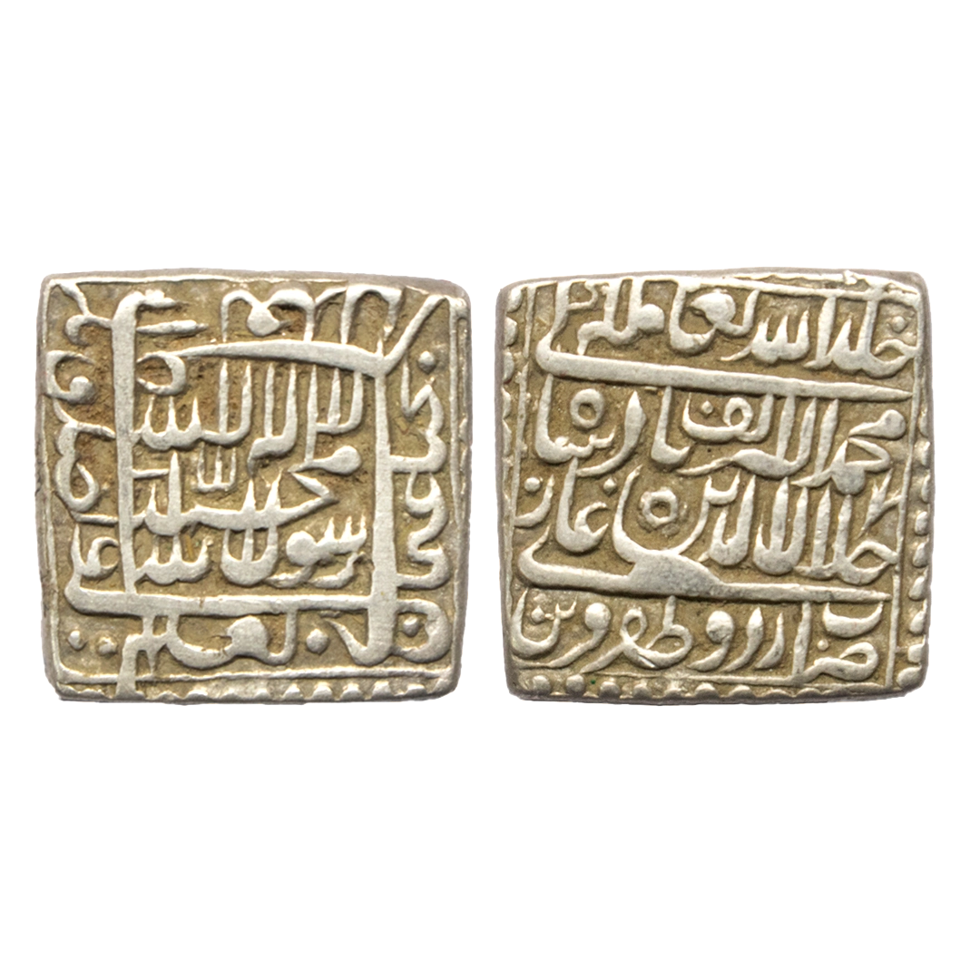 Mughal, Akbar (AH 963-1014, 1556-1605 AD), Silver Square Rupee, 11.33 gms, Urdu Zafar Qarin Mint (fully visible at bottom on obv), AH Alif (1000), KM # 82.8, very fine+, rare in this flan size and grade.