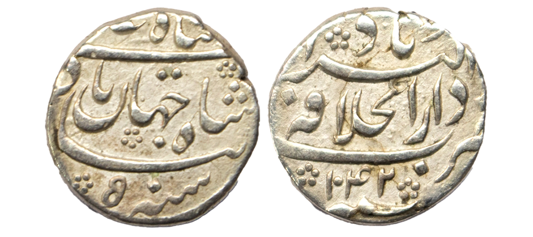Mughal, Shah Jahan (AH 1037-1068, 1628-1658 AD), Gold Mohur, 10.78 gms, Akbarabad Mint, AH 1047, RY 11, Obv: The Kalima Shahada in quarterfoil & four khalifas name in margin, Rev: Shahjahan Badshah Ghazi, hijri date 1047 & regnal year 11 in quarterfoil, Shihab ud-din Muhammad saheb-e-qiran sani & mint name Akbarabad in margin, KM # 258.1, Almost Complete Die Striking Visible. Extremely fine+, rare.