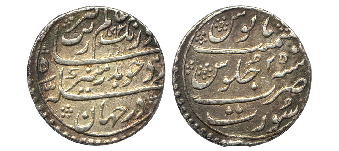 Mughal, Aurangzeb (AH 1068-1118, 1658-1707 AD), Silver Rupee, 11.48 gms, Surat Mint, AH 1093, RY 25, KM # 300.86, very fine, very scarce. Big Flan with Dotted Border on Both Sides.