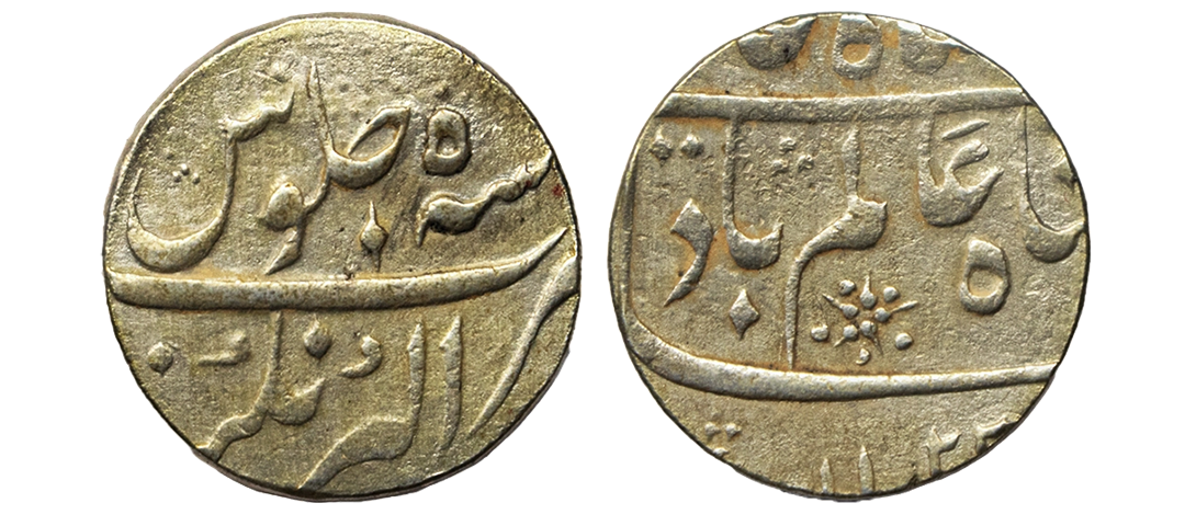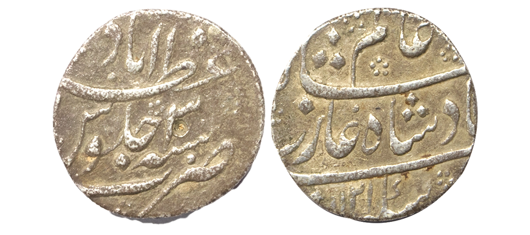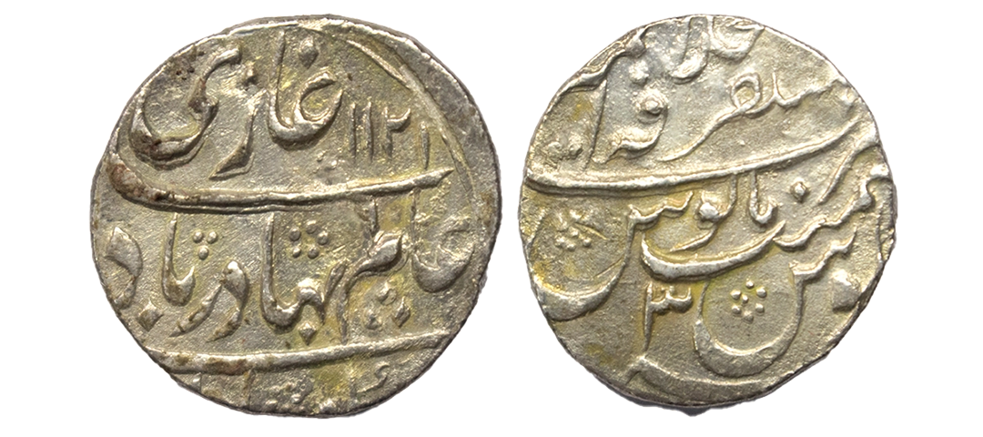Mughal, Kam Baksh (AH 1119-1120, 1707-1708 AD), Silver Rupee, 11.33 gms, 23.30 mm, Dar-ul-Zafar Bijapur Mint, RY 2, Din-e-Panah couplet, Obv: Persian legend “sikka zad dar dakkan bar khursheed-o-mah, Badshah Kam Bakhsh, dine panah” with 1119 Hijri year, Rev: Persian legend “sana Ahad julus, zarb Bijapur" with epithet "Dar-uz-zafar” at the bottom, the couplet means Struck coins in the Dakkan on the sun and moon, the emperor Kam Baksh, refuge of the faith, KM # 336.2, extra fine, Complete Mint Name, extremely rare in this grade.