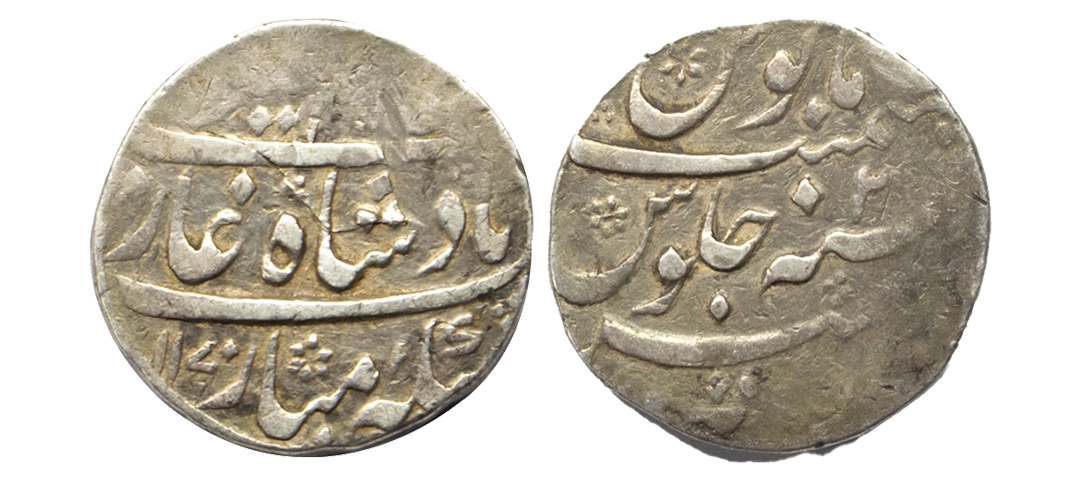 Mughals, Alamgir II (AH 1167-1173 / 1754-1759 AD), Silver Rupee, 11.58Grms, Jahangirnagar (Dacca) Mint, RY Ahd, sun symbol on obv as mint mark. (KM # 460.9).