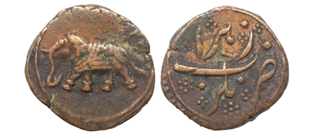 Independent Kingdoms, Mysore, Tipu Sultan (AM 1215-1227, 1787-1799 AD), Copper Paisa, 11.20 gms, Kalikut Mint, AM 1201, Obv: elephant walking to right with above am year within a dotted circle, Rev: Persian legend "zarb Kalikut", KM # 73, very fine, rare.