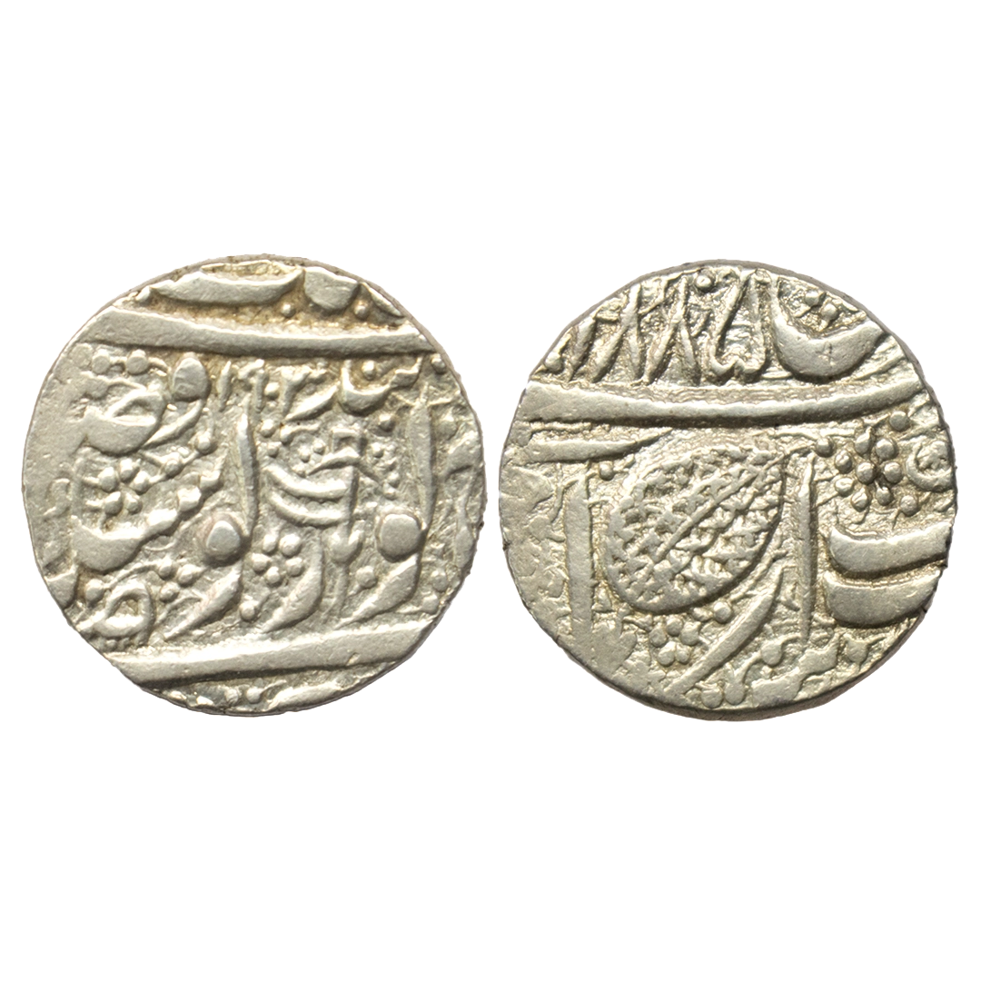 Sikh Empire, Amritsar Mint, Silver Rupee, 11.00Grms, Nanank Shahi Couplet, VS [18]85, Trident symbol on obv., large leaf symbol on rev. (KM # 22.5). Trishul on Obverse.