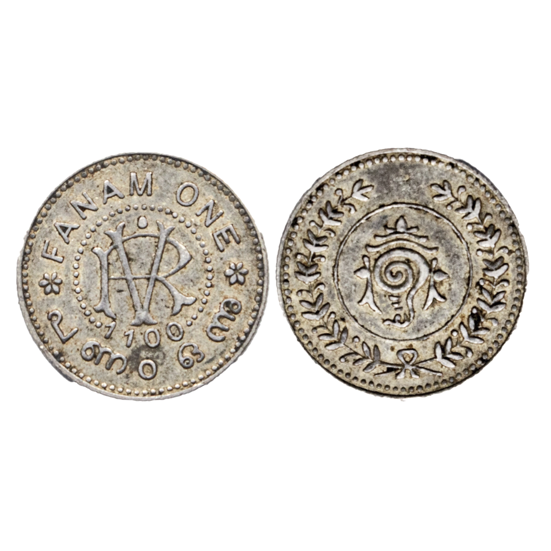 Travancore, Rama Varma VI (ME 1062-1101 / 1885-1924 AD), Silver Fanam, 1.56Grms, ME 1100, OBV: Conch within wreath, REV: RV monogram with value and date. (KM # 51).
