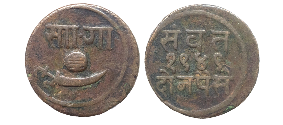 Indian Princely States, Baroda State, Sayaji Rao III (AH 1292-1357 / VS 1932-1995 / 1875-1938 AD), Copper Paisa, 7.76 gms, Baroda Mint, VS 1947, AD 1880, Obv. inscription, Rev. Nagari "Sa Ga" and scimitar, KM # Y24, very fine, rare.