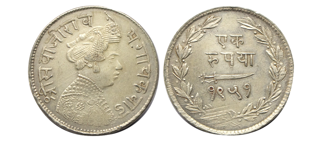 Indian Princely States, Baroda State, Sayaji Rao III (AH 1292-1357 / VS 1932-1995 / 1875-1938 AD), Copper Paisa, 7.76 gms, Baroda Mint, VS 1947, AD 1880, Obv. inscription, Rev. Nagari "Sa Ga" and scimitar, KM # Y24, very fine, rare.