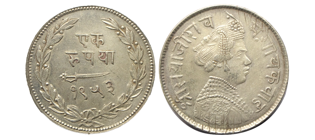 Indian Princely States, Baroda State, Sayaji Rao III (AH 1292-1357 / VS 1932-1995 / 1875-1938 AD), Copper Paisa, 7.76 gms, Baroda Mint, VS 1947, AD 1880, Obv. inscription, Rev. Nagari "Sa Ga" and scimitar, KM # Y24, very fine, rare.