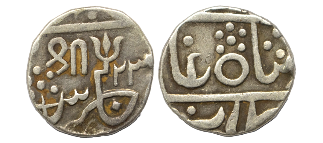 Garhwal (Tehri), Lallat Shah (VS 1829-1838/1772-1781 AD), Silver Timasha, 2.38Grms, Srinagar Mint, in the name of Shah Alam II, complete mint name on rev top area. (KM # C20).