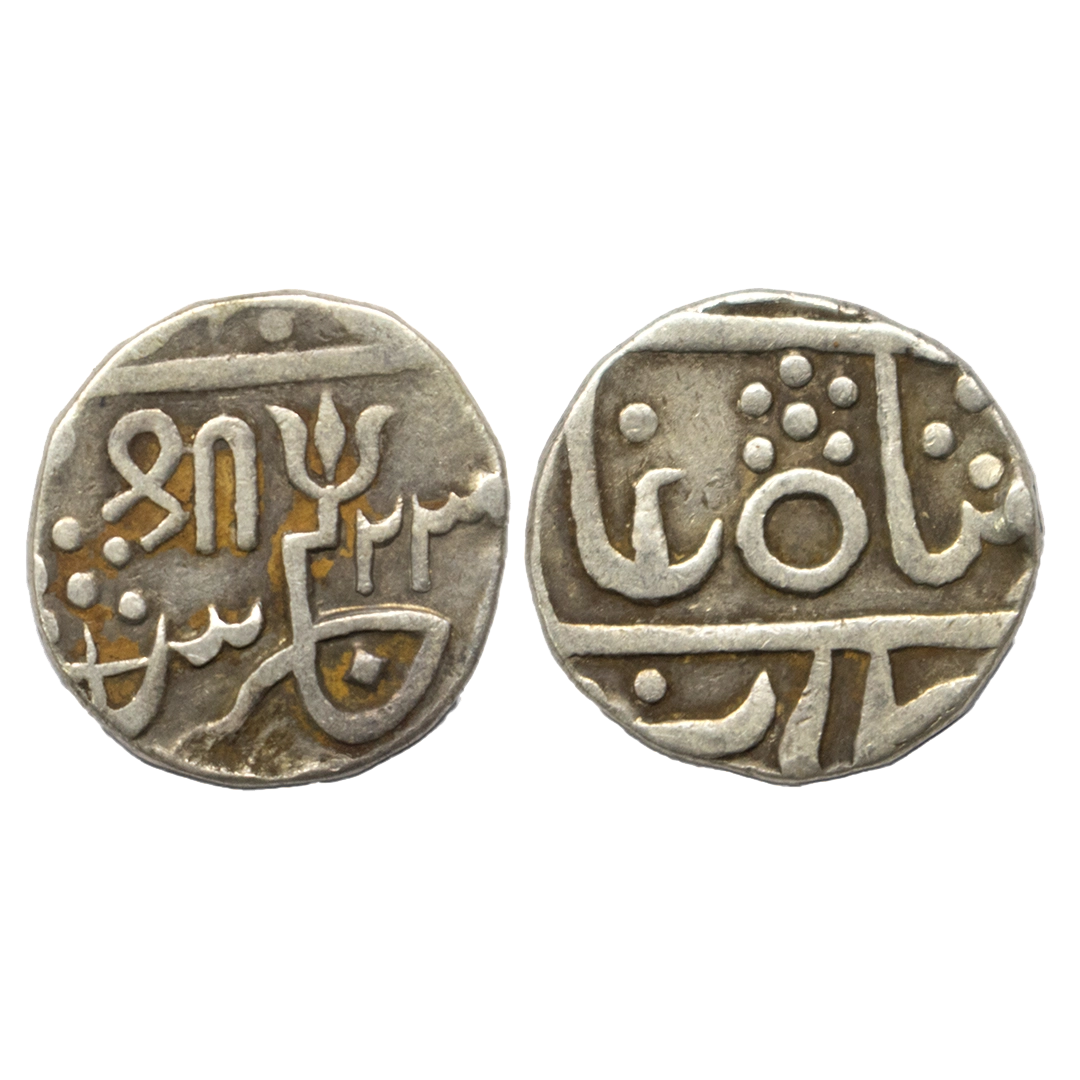 Indian Princely States, Gwalior State, INO Shah Alam II (AH 1174-1221, 1759-1806 AD), Silver Rupee, 10.65 gms, Jean Baptiste Filose, Isagarh Mint, cannon on obv. fly whisk & inverted battle axe symbols on rev, JONS # 198, very fine, very scarce.