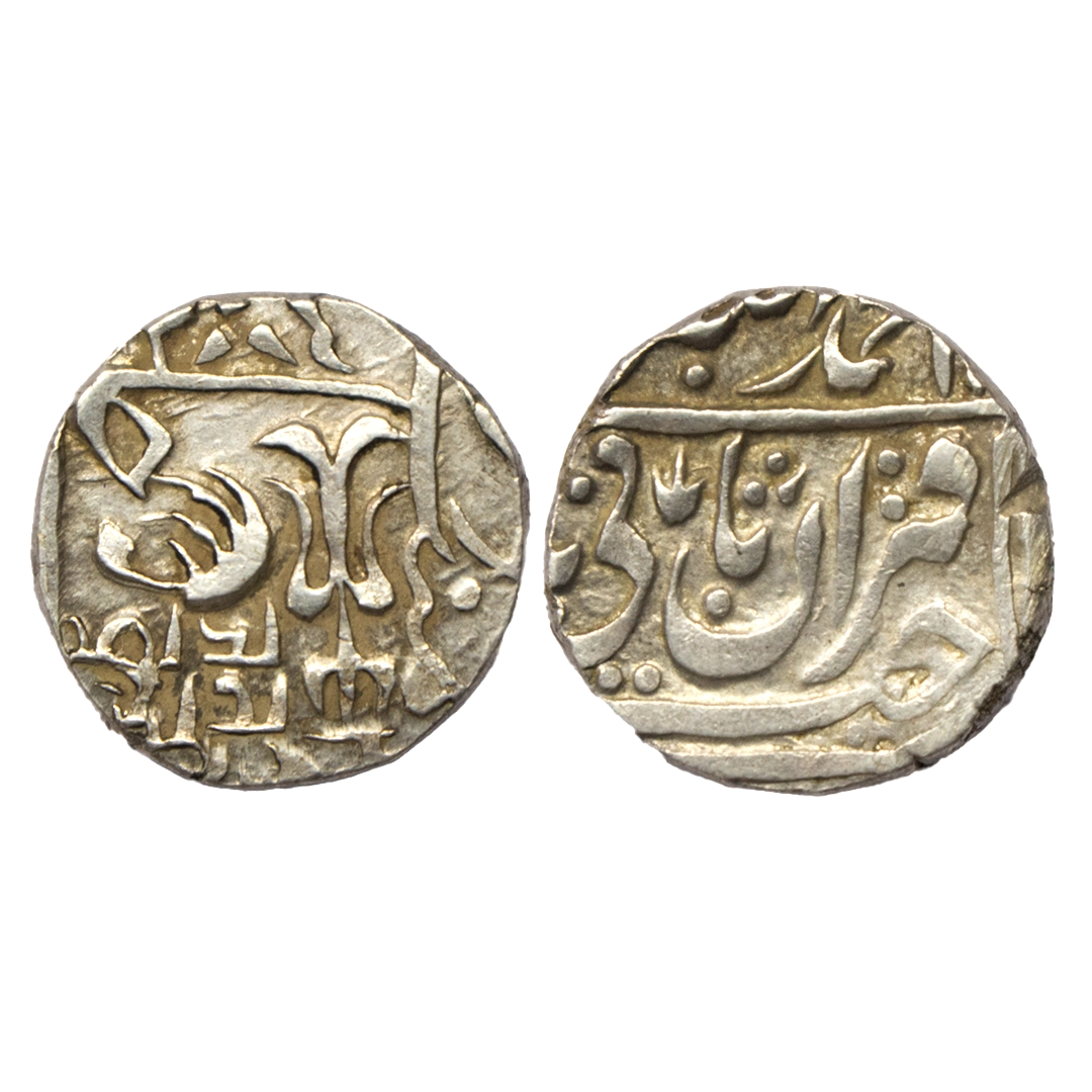 Indian Princely States, Gwalior State, INO Shah Alam II (AH 1174-1221, 1759-1806 AD), Silver Rupee, 10.65 gms, Jean Baptiste Filose, Isagarh Mint, cannon on obv. fly whisk & inverted battle axe symbols on rev, JONS # 198, very fine, very scarce.