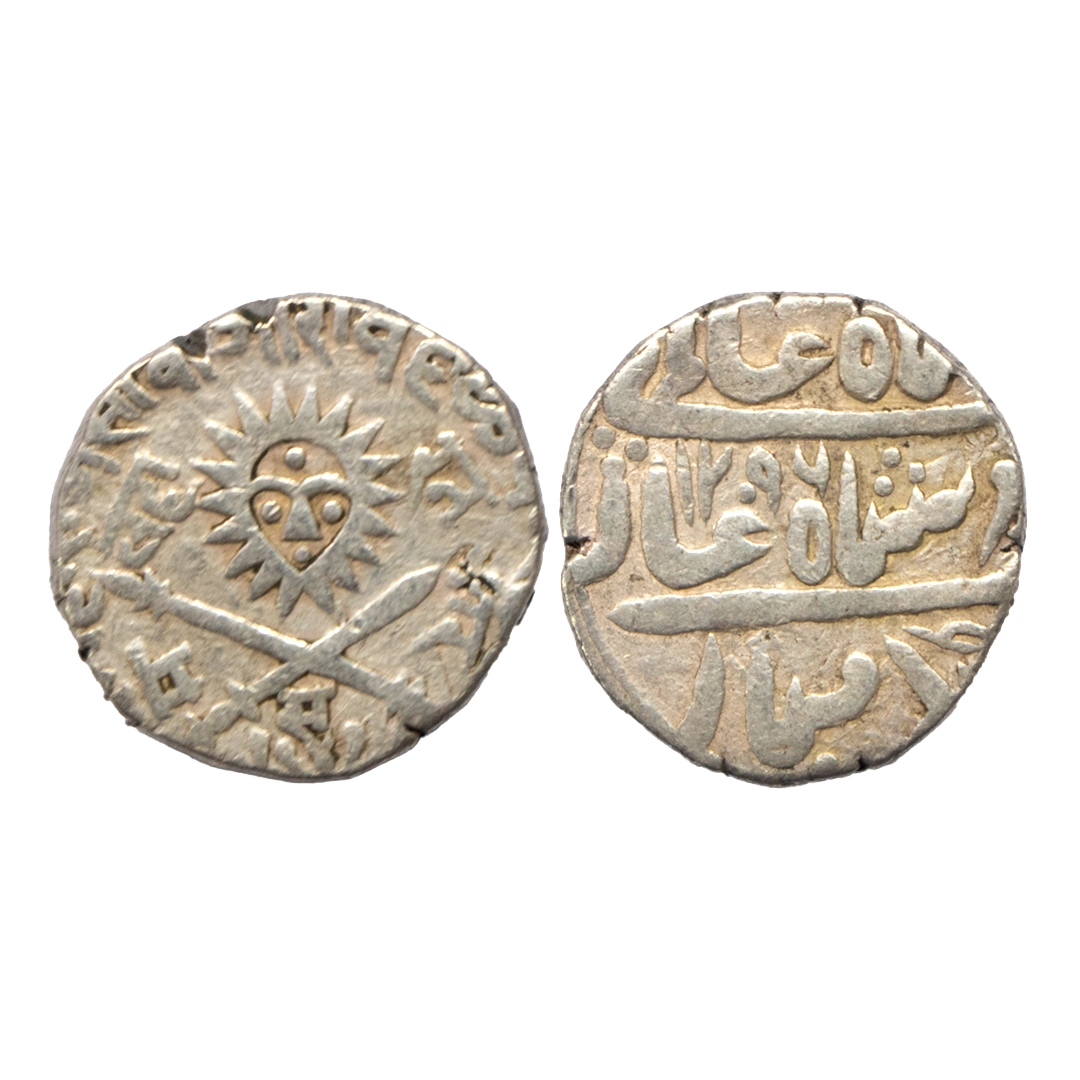 Indore State, Jaswant Rao (AH 1213-1226, 1798-1811 AD), Nazarana Silver Rupee, 14.72 gms, Indore Mint, INO Muhammad Akbar II, AH 1222, RY 21, KM # 8, extra fine, very rare.
