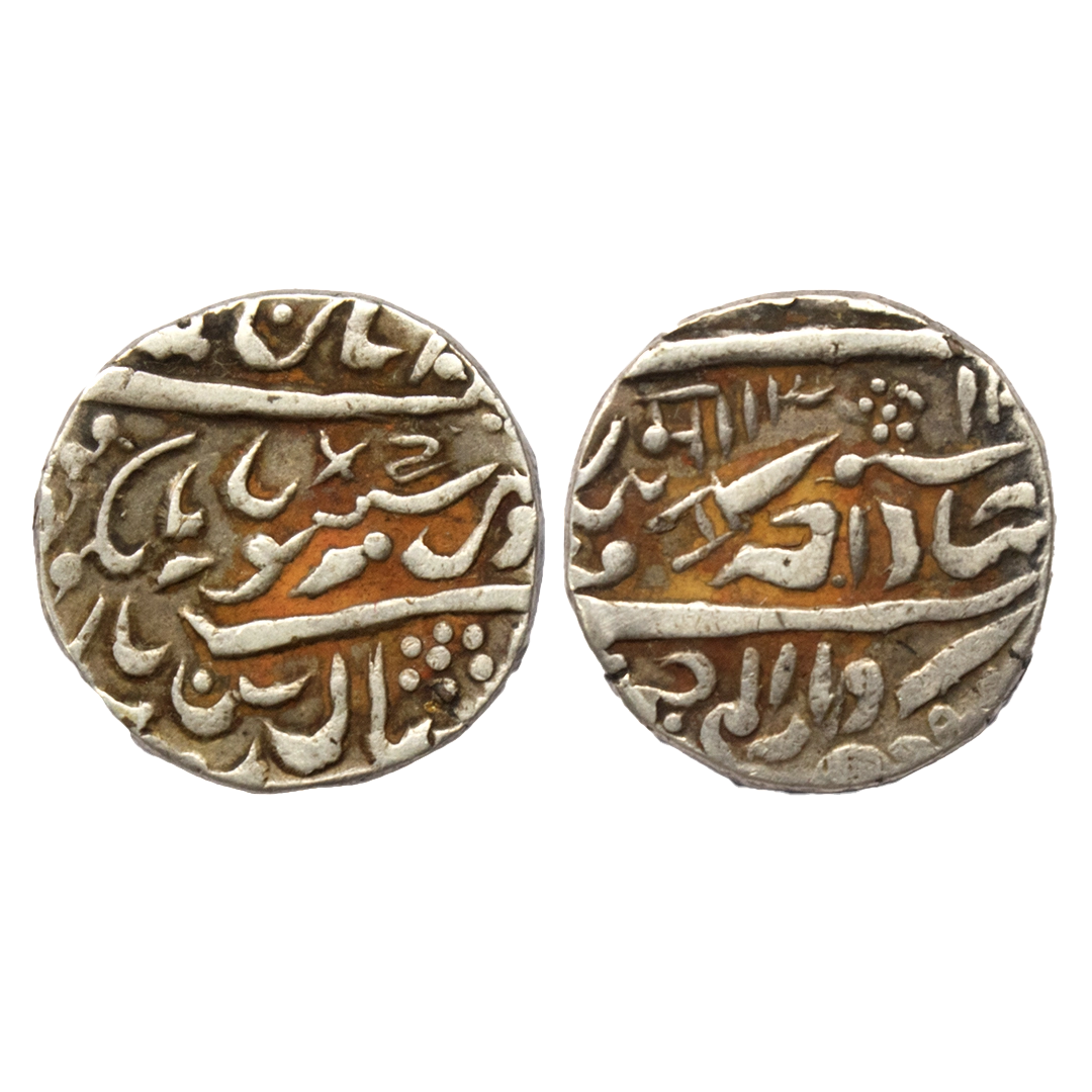Jodhpur State, INO Shah Alam II (AH 1174-1221, 1759-1806 AD), Silver Rupee, 11.41 gms, Dar al Mansur Jodhpur Mint, AH 1208, RY 25, with pseudo name Dar al Mansur Jodhpur, sword symbol, Obverse reads. sikka mubarak badshah ghazi Shah Alam, Reverse reads. sanah julus manus maimanat Zarb Dar al Mansur Jodhpur, KM # 18, very fine, very scarce.