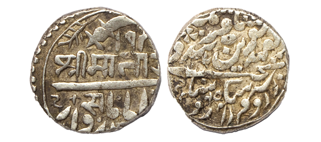 Indian Princely States, Jodhpur State, Takhat Singh (AH 1259-1290, 1843-1873 AD), INO Queen Victoria, Silver Rupee, 11.37 gms, Dar al Mansur Jodhpur Mint, RY 52, Obv: ba ahad hind-o-farang, Rev: jhar sword, sri mathaji in nagari sa, KM # 196.1, very fine, very scarce.