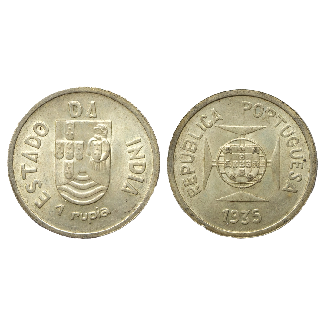Indo Portuguese, Set of 2 Coins, Silver Rupia & 1/2 Rupia, 1935 AD, 1936 AD, Obv: Shield on lined circle at centre of Maltese cross, Rev: Divided Shield, KM # 23 & 22, extra fine, very scarce.