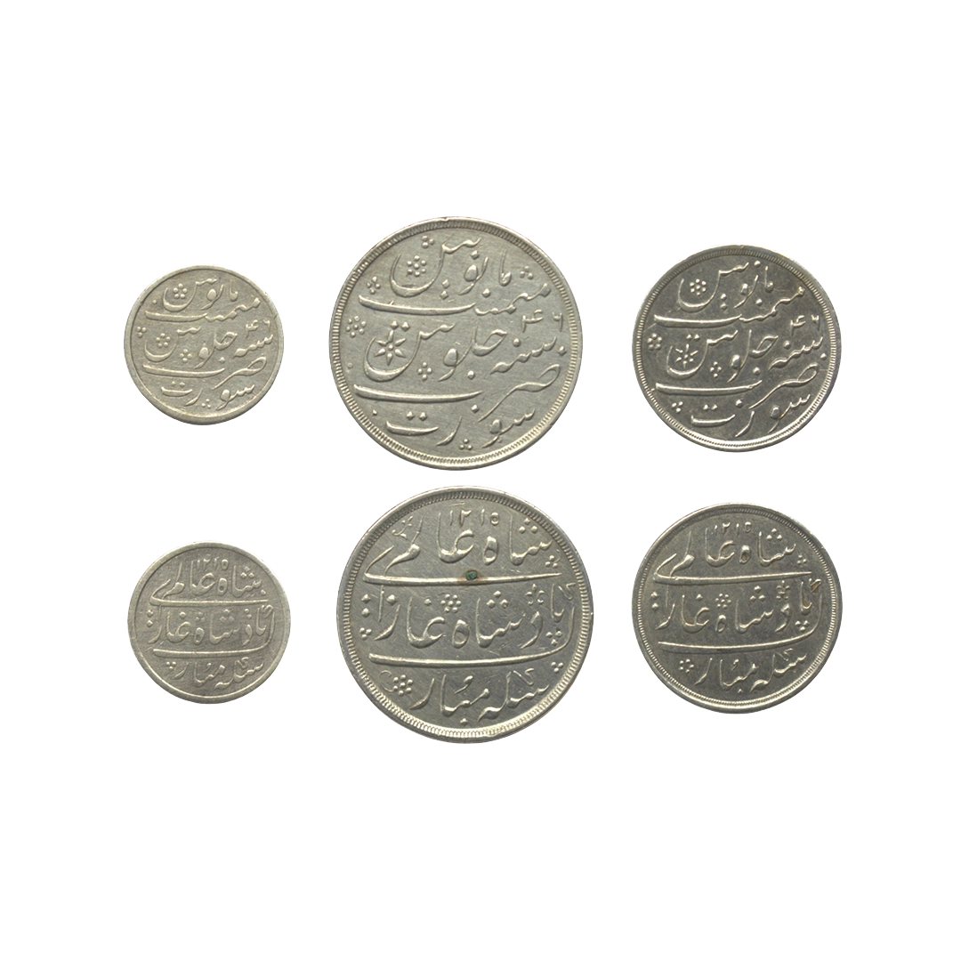 East India Company, Bombay Presidency, INO Shah Alam II (AH 1174-1221, 1759-1806 AD), Set of 3 Coins, Silver Rupee, 1/2 Rupee, 1/4 Rupee, Surat Mint, AH 1215, RY 46, KM # 224, 223, 222, very fine+, rare as a set.