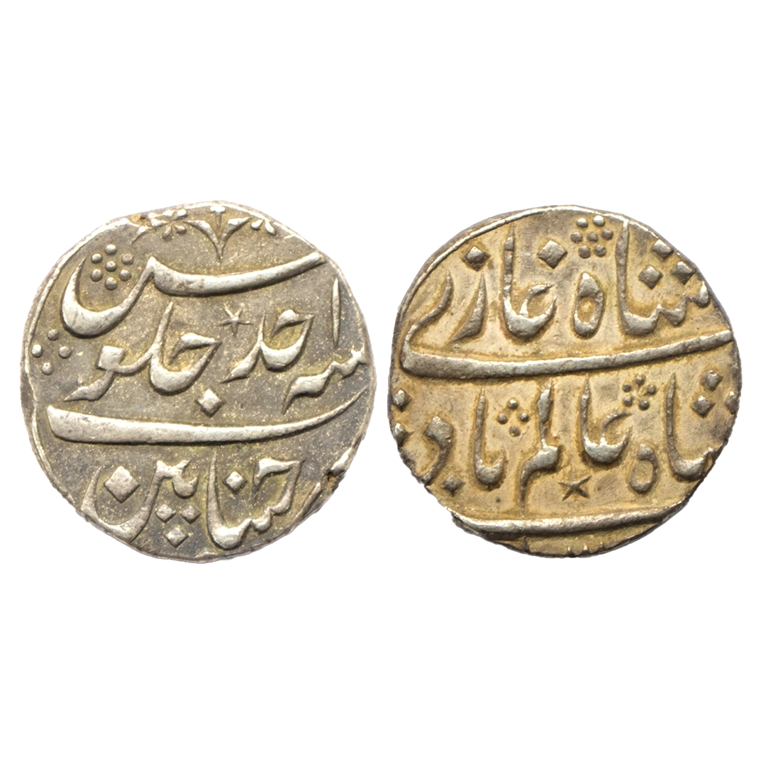 East India Company, Madras Presidency, INO Shah Alam Bahadur (AH 1119-1124, 1707–1712 AD), Silver Rupee, 11.57 gms, Chinapatan Mint, RY Ahd, Star mint mark, Obv: Persian legend "Sikka Shah Alam Badshah Ghazi", Rev: Persian legends "sana Ahd julus" & "zarb Chinapatan", KM # A302, very fine+, rare.