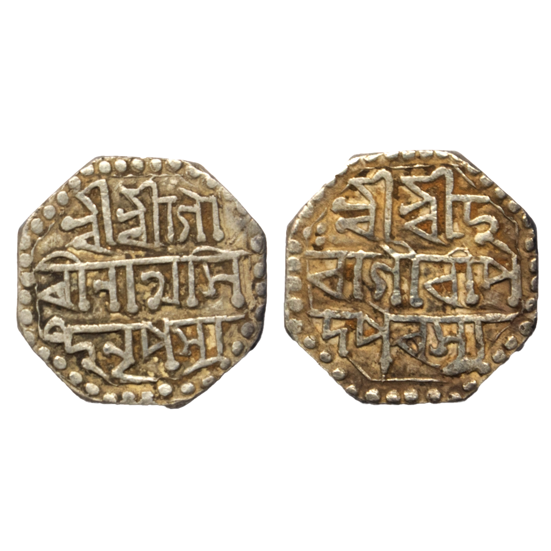 Assam, Gaurinatha Simha (SE 1702-1718, 1780-1796 AD), Silver 1/2 Rupee, Contemporay Token, 3.37gms, Obverse on the coin reads. “Sri Sri Ha/ra Gauri Pa/da Parasya” Reverse on the coin reads. “Sri Sri Gau/rinatha Simha/ Nripasya” , KM # 192, very fine+, scarce.