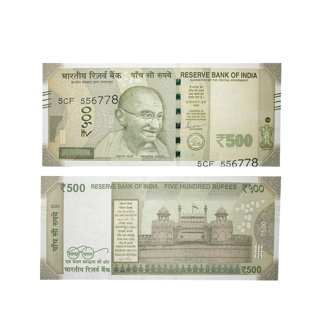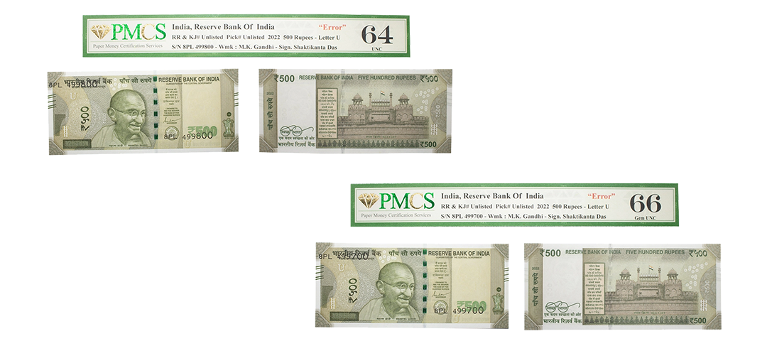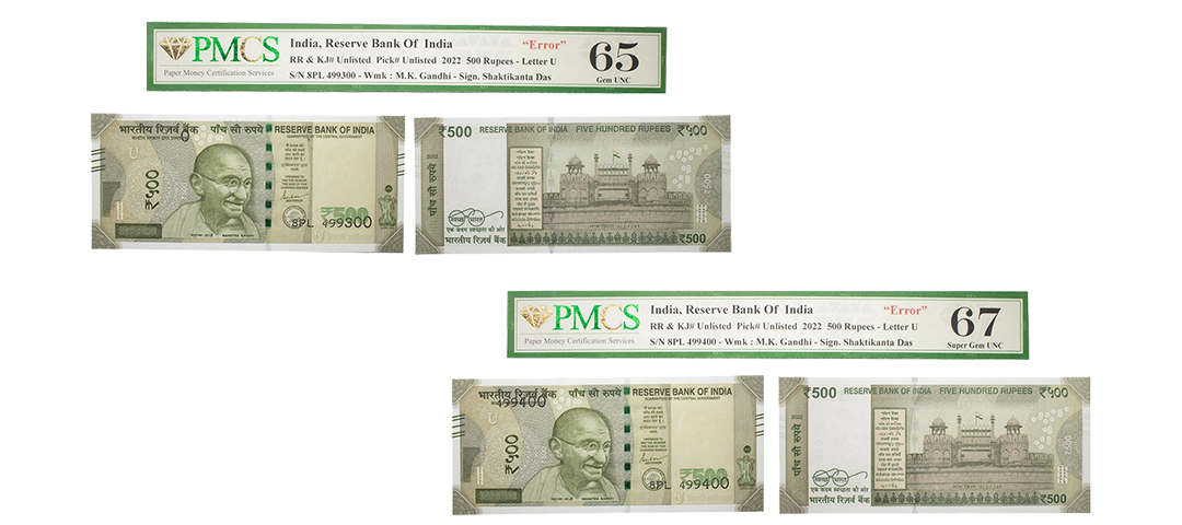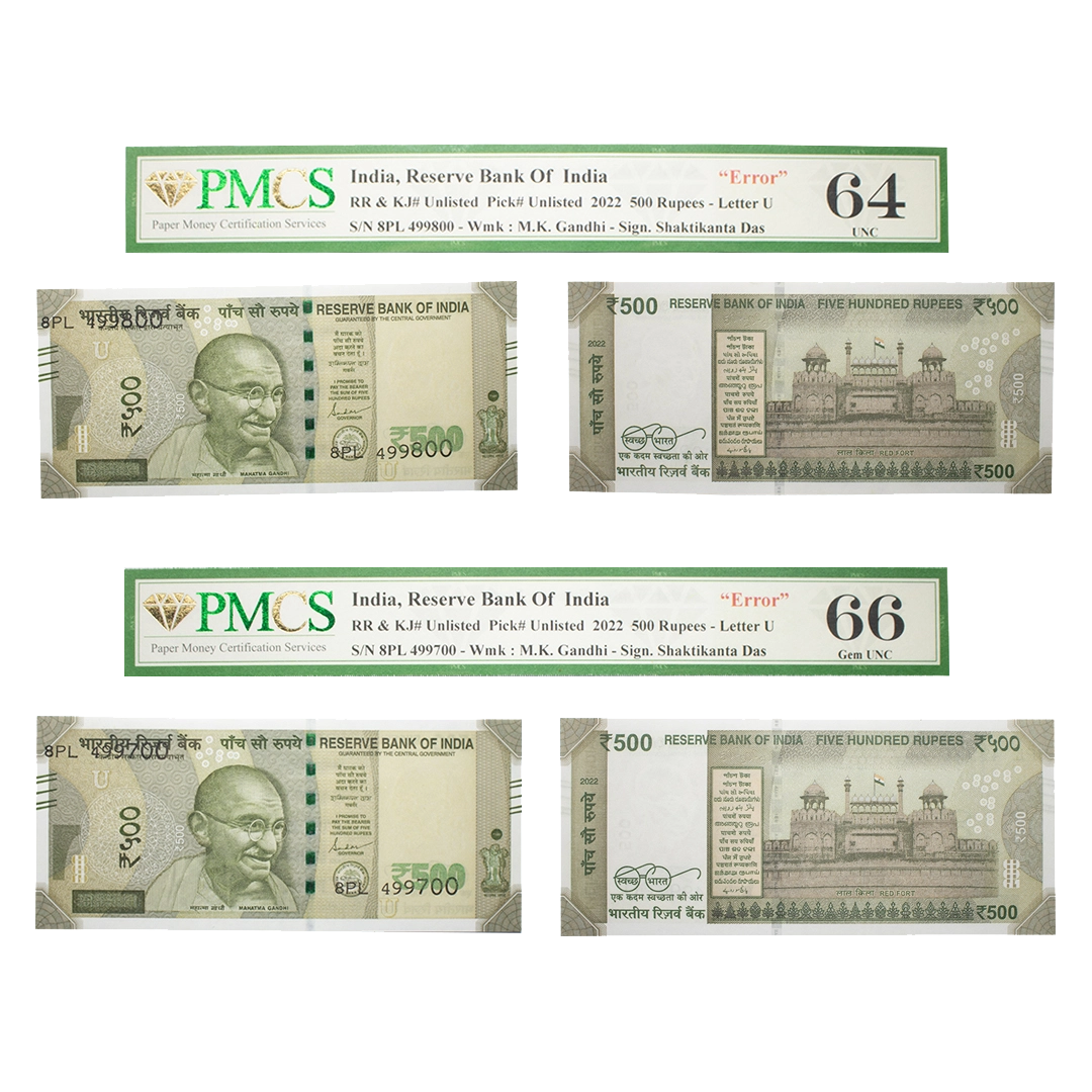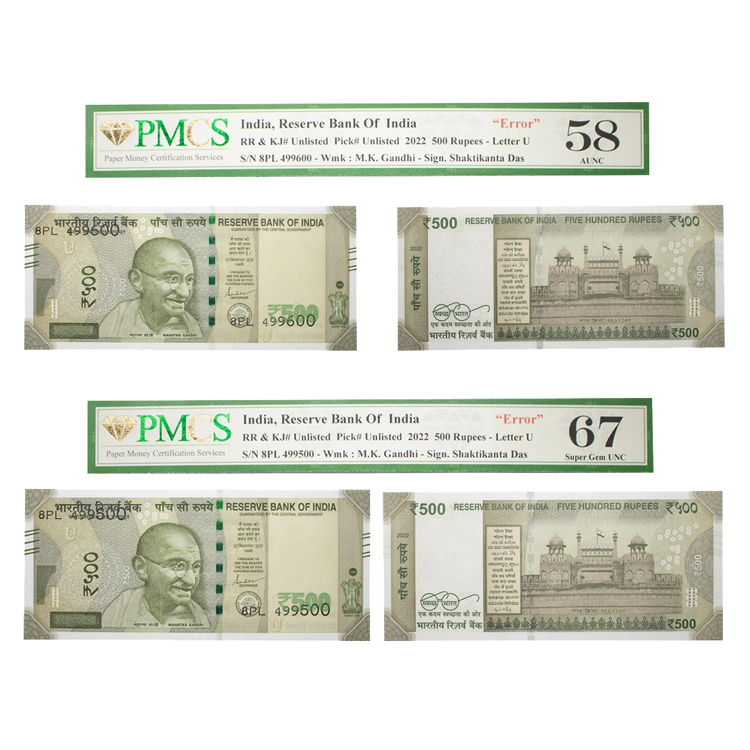 500 Rupees, misprint, New Gandhi series, 2022, Set of 10, signed by Shashikanta Das, inset 'U', print shifted error of S.No to extreme top on above & below of the note, Graded as AUNC 58 & UNC 63 by PMCS, Rare.