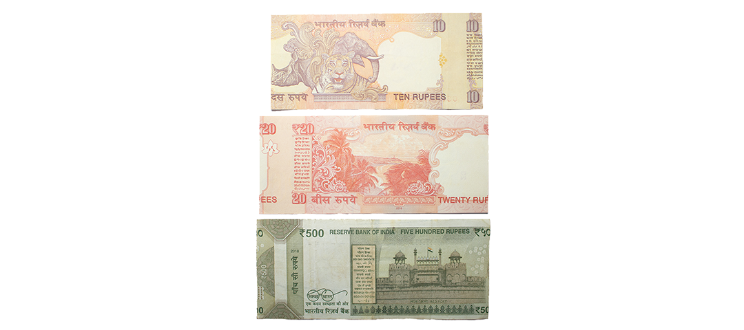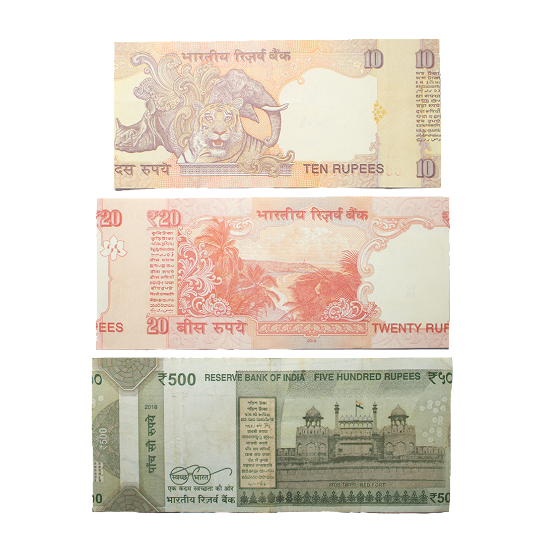 Group of 3 Notes, 10 Rupees, 20 Rupees, 500 Rupees, Vertical Misaligned cutting error, 2003, 2010, 2018, major shifting and vertical misaligned cutting error, very fine to extra fine, very rare.
