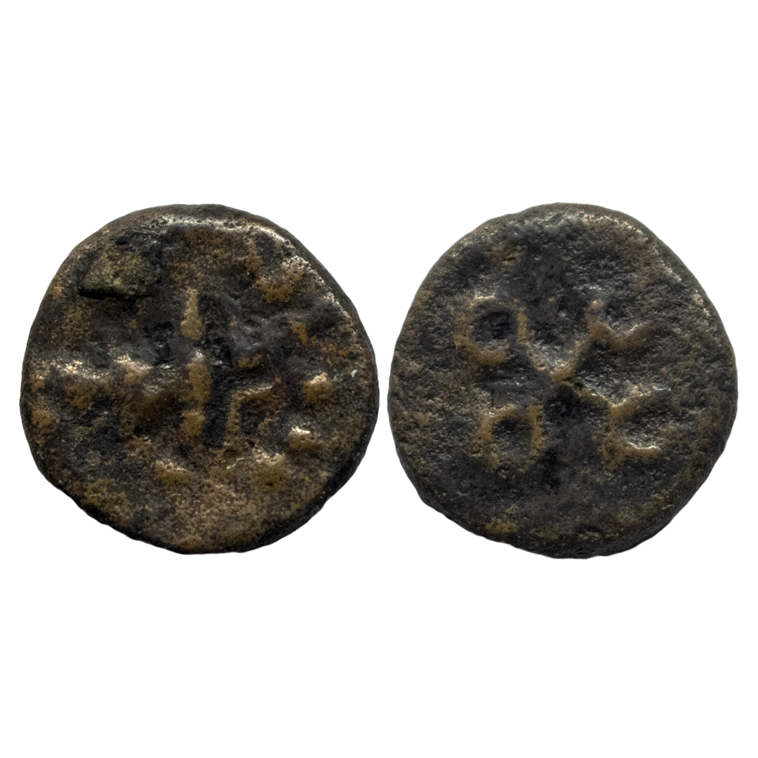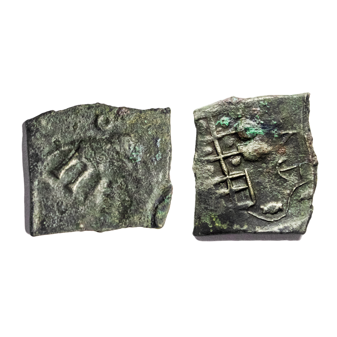 Ancient, Ujjain (2nd-1st Century BC), Copper Unit, 4.05 gms, Obverse: Standing Mahakaal, holding a sun standard, Tree-in-railing at left, Reverse: Ujjain symbol, very fine, very scarce.