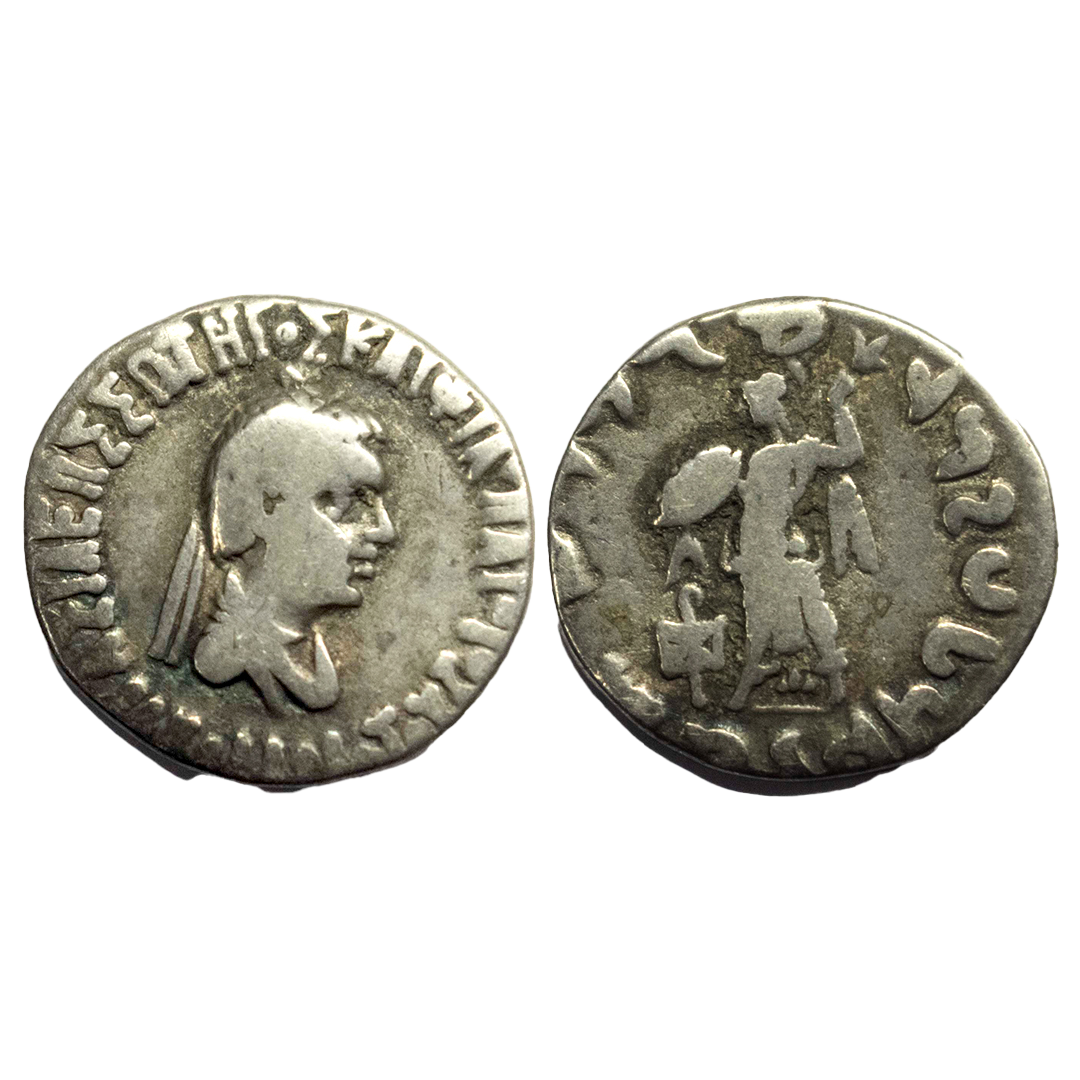 Ancient, Indo-Greeks, Apollodotus II (c. 80-65 BC), Silver Drachm, 2.29 gms, Obverse: A diademed bust of king to right, Greek legend around reading ‘BAΣIΛEΩΣ ΣΩTHPOΣ AΠOΛΛOΔOTOY’ (Basileos Soteros Apollodotou), Reverse: Athena Alkidemos standing, holding Aegis on one outstretched left arm and hurling thunderbolt with other hand, Kharoshthi legend around reading ‘Maharajasa Tratarasa Apaladatasa’ tamgha on lower left field, MIG # 425l, very fine, very scarce.