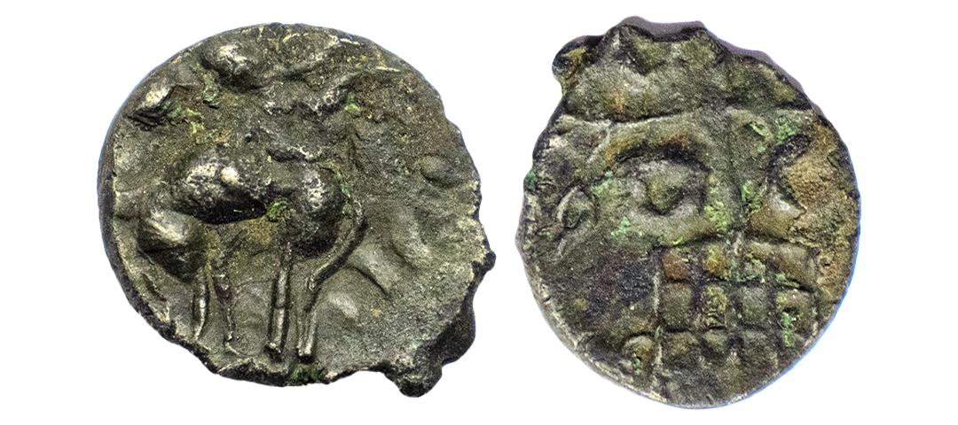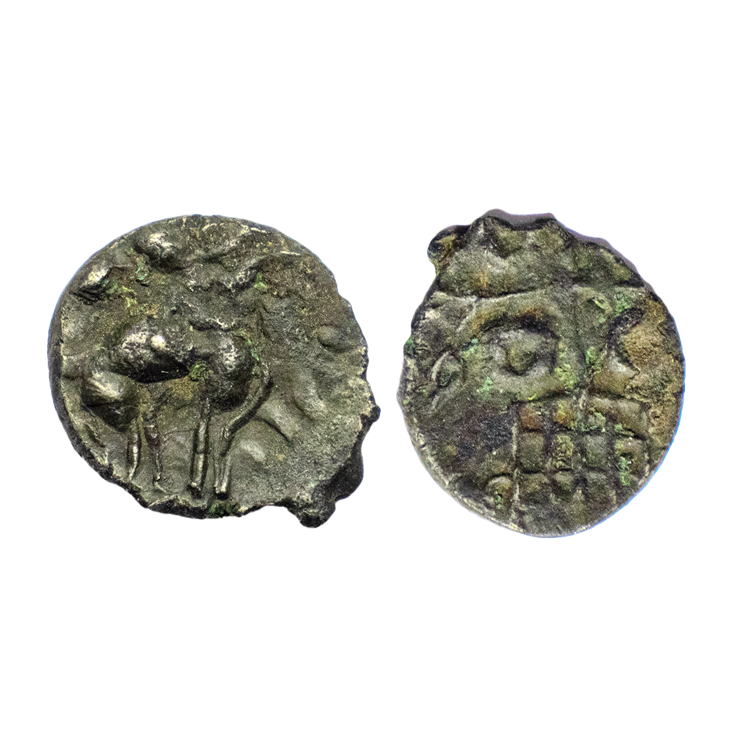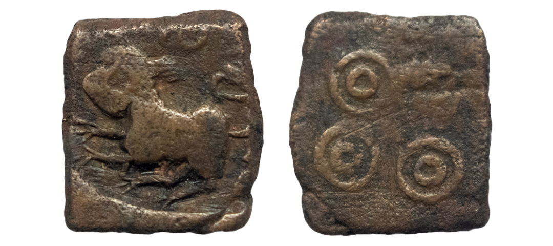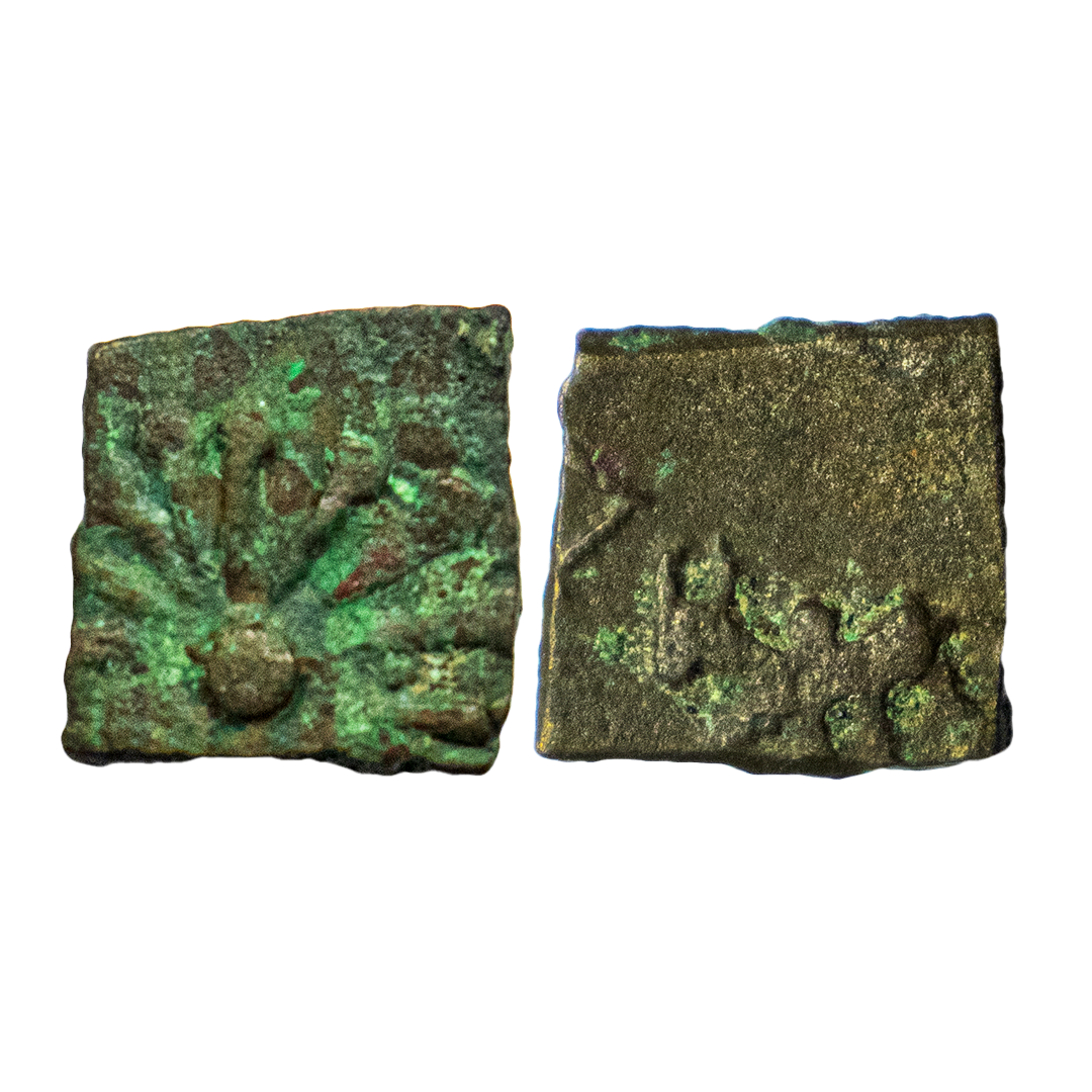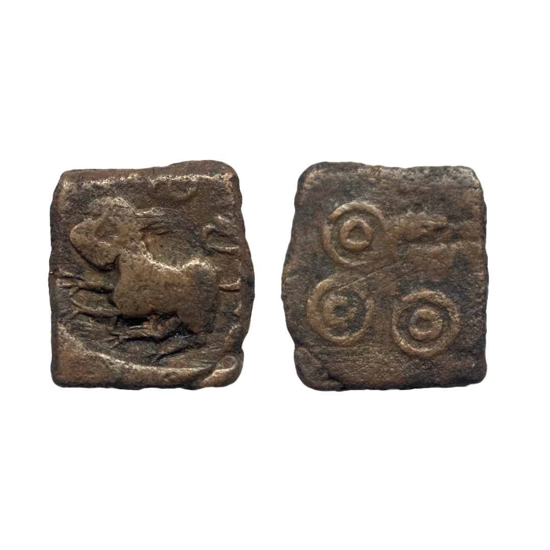 Ancient, Pre Satavahana, Vidarbha (2nd-1st Century BC), Copper Unit, 1.23 gms, Obverse: elephant facing right, Reverse: ujjaini symbol, hollow cross & tree in railing, very fine, scarce.