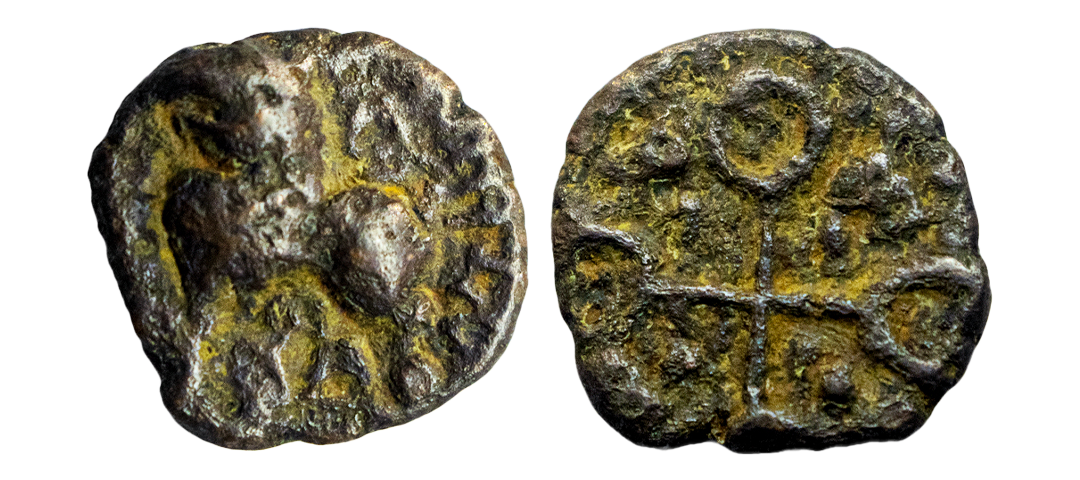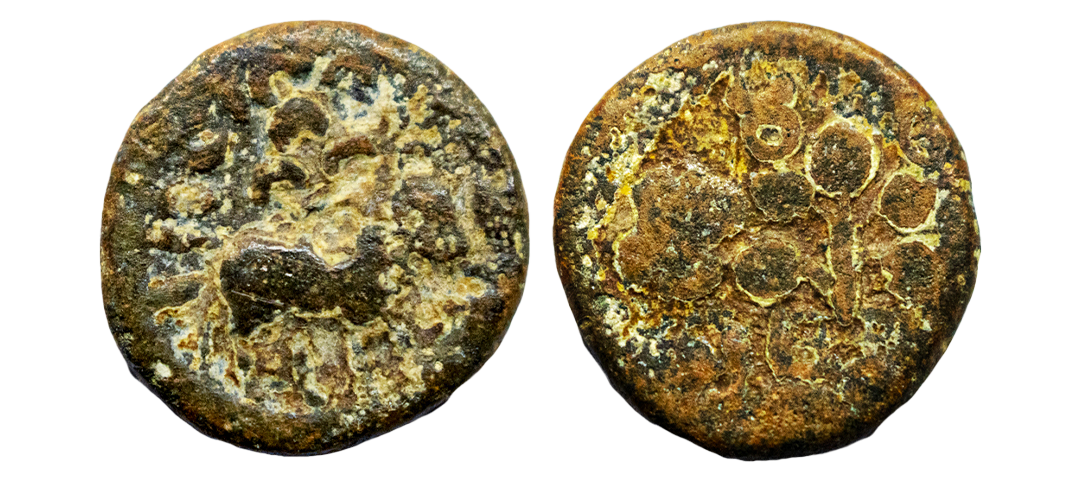 Ancient, Satavahanas, Siri Satakarni ( 200 BC), Copper Unit, 5.38 gms, Obv: Elephant standing right, with trunk upraised; 'Ujjain' symbol above; Brahmi legend Rano Satakanisa, Rev: Tree in railing with split leaves, very fine, very scarce.