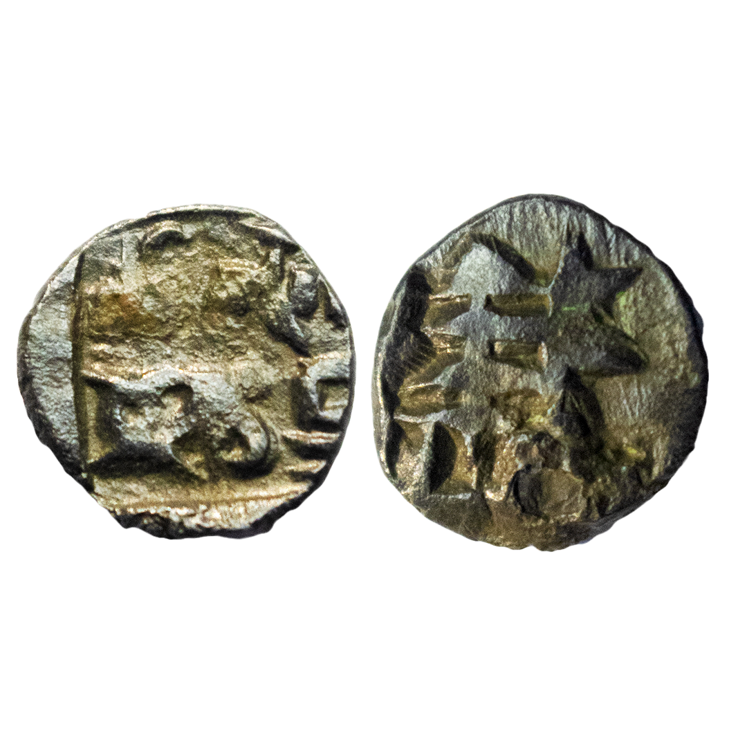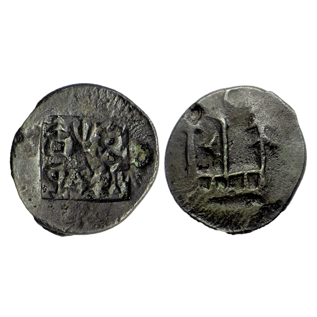 Unique coin of Rudrasena I, Hardly Few Specimen Known, In this legend the patronymic is shown as Rudrasihasaputrasa. No coin with this legend and this date was known for Rudrasena I as Kshatrapa until Fishman published an example, which he describes as unique. Western Kshatrapas, Kardamaka Dynasty, Rudrasena I (c. 198-222 AD), son of Rudrasimha I, SE 124, Silver Drachma, 2.38Grms, OBV: Bust of king facing to right side date digit behind in Brahmi and around corrupt Greek letters, REV: Three arched hill with crescent in centre, moon to left and sun to right, aroubd Brahmi legend’Rajno Mahakshatrapasa Rudrasihasaputrasa Rajno Mahakshatrapasa Rudrasenasa’. (Pieper # 3381). Very Fine+.