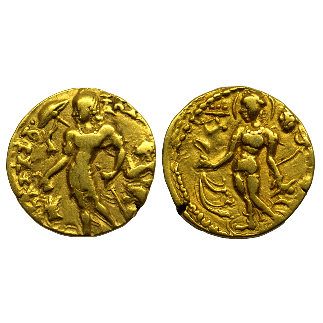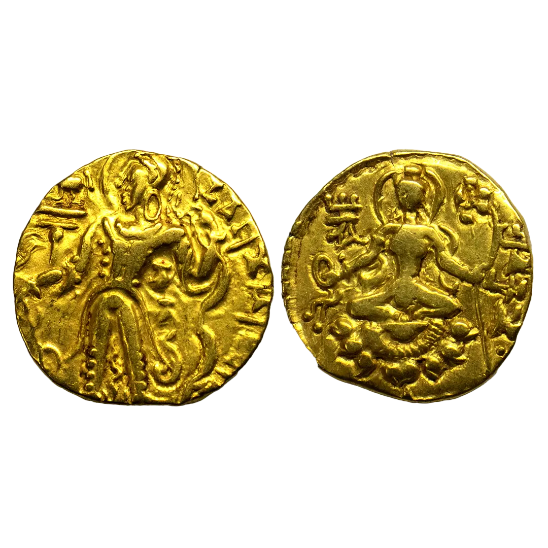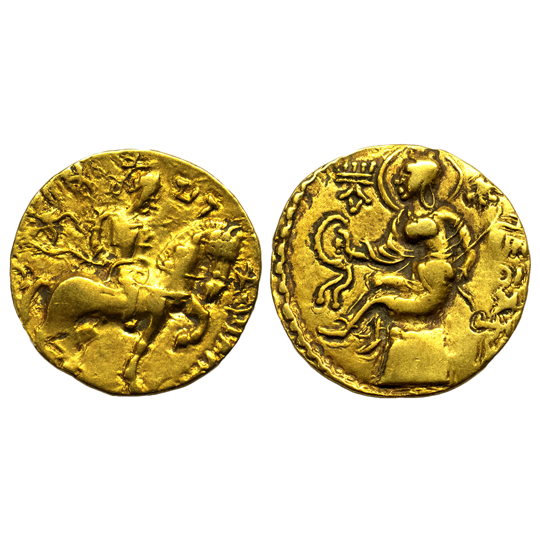 Ancient, Gupta Empire, Chandragupta II (380-415 AD), ‘Horseman’ Type, Gold Dinara, , Obv: King on horseback facing to right, caparisoned horse in prancing position to left, king wearing ear-rings, armlets and necklace, king has large bun behind head without halo, Brahmi legend around starting from 1 O clock ‘Paramabhagava(taoMaharajadhiraja Sri Chandra)guptah’, Rev: Goddess Lakshmi seated in profile on a wicker stool holding a long stemmed flower with leaves and buds in her left hand, right hand is holding a diadem, she is wearing earrings and necklace, tamgha on left field and Brahmi legend ‘Ajitavikramah’ in the right field, Shivlee # Class II, var. A2, very fine, very rare.