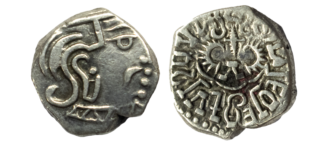 Ancient, Guptas, Chandragupta II (375-415 AD), Archer type, Gold Dinara, Obverse: standing facing, nimbate head left, wearing short curly hair, tight-fitting cap with strings of pearl-diadems at back, tight-fitting Kushana style clothing, and jeweled armbands, arrow in right hand, grounded bow in left; Garuda standard to left, Chandra to inner right, Reverse: Goddess Lakshmi, nimbate, seated in the padmasana posture on a lotus, diadem in right hand, lotus stalk in left; tamgha to left, Shivlee # Class III A.3, very fine, very rare.