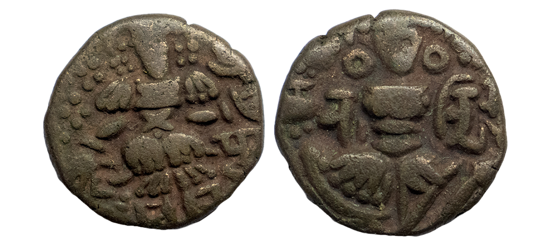 Hindu Rulers of Medieval Kashmir, First lohara Dynasty, Kalasa Raja Deva (1064-1090 AD), Copper Stater,, Obv: highly stylized standing king facing, sacrificing at altar at left, legend at right in Sarada script 'Deva', Rev: Ardokhsho (Lakshmi) enthroned facing front, legend at left in Sarada script 'Ka' and at right 'lasa', very fine, scarce.