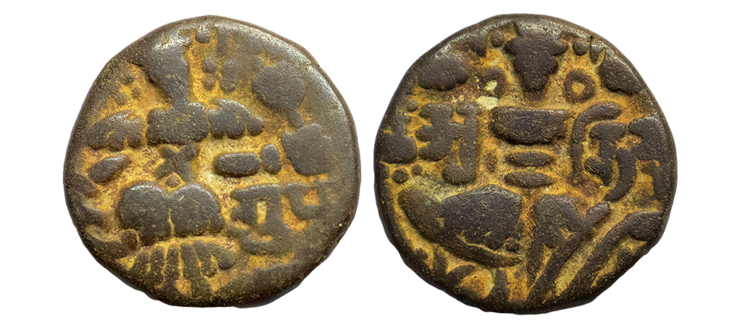 Hindu Rulers of Medieval Kashmir, First lohara Dynasty, Kalasa Raja Deva (1064-1090 AD), Copper Stater,, Obv: highly stylized standing king facing, sacrificing at altar at left, legend at right in Sarada script 'Deva', Rev: Ardokhsho (Lakshmi) enthroned facing front, legend at left in Sarada script 'Ka' and at right 'lasa', very fine, scarce.