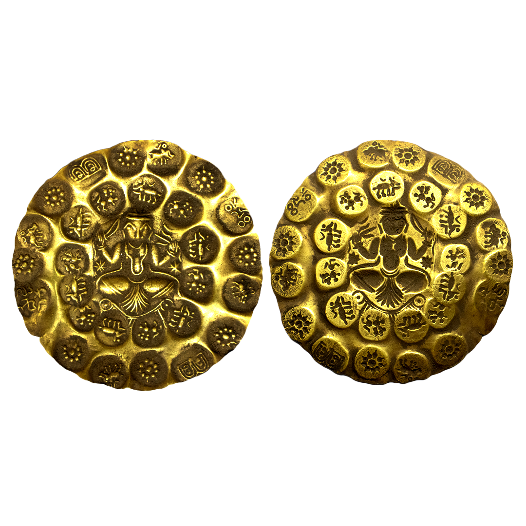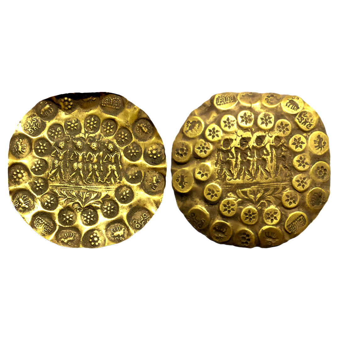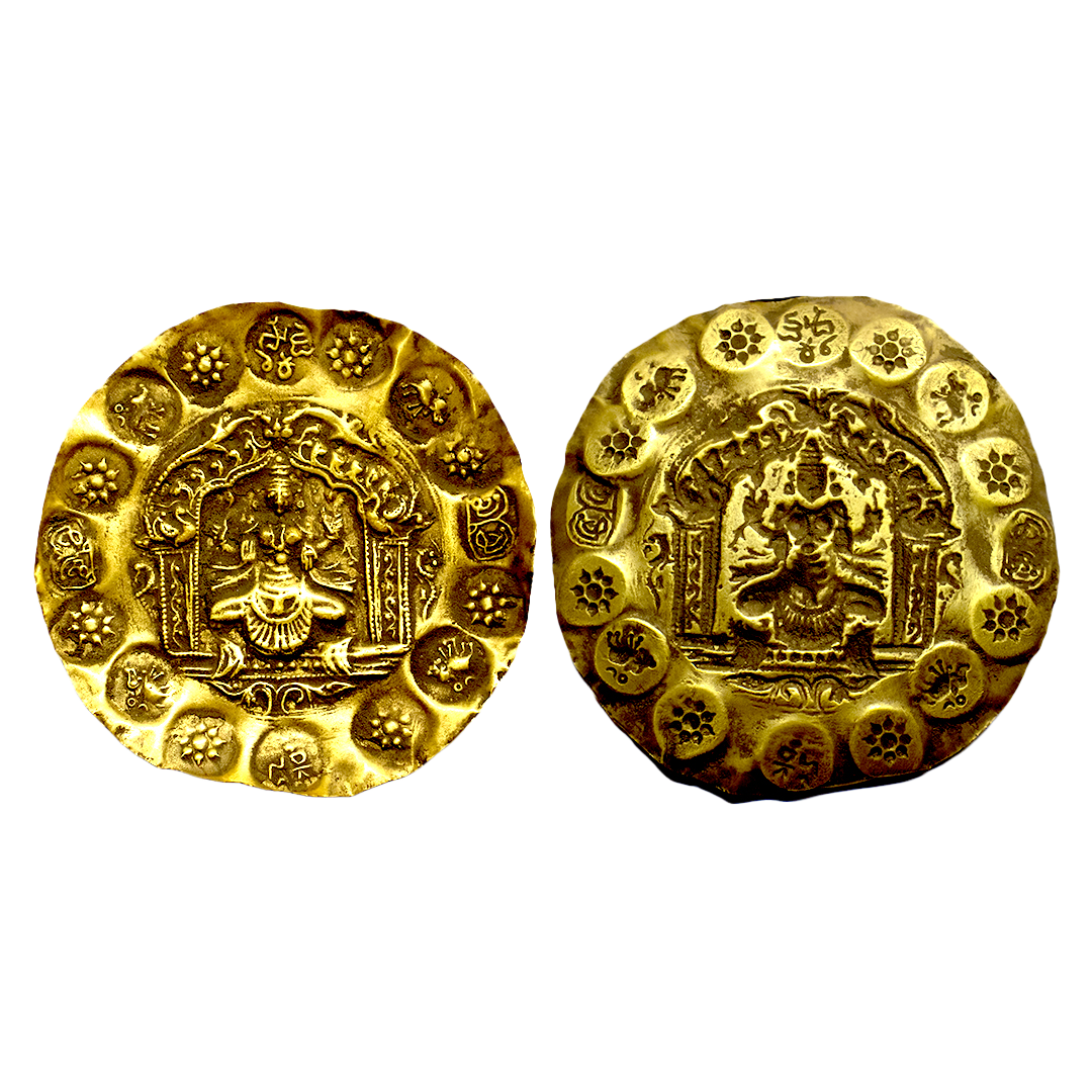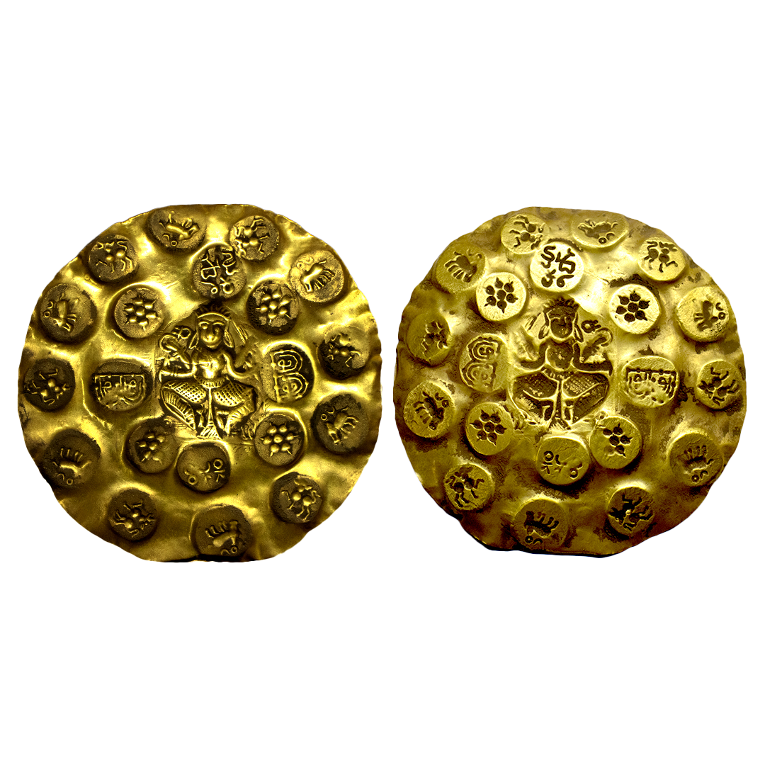 Kakatiyas of Warrangal, Prola- II (1110-1158 CE), Gold PMC, 2 ½ Gold Gadyana, ‘God Bhairava’ type, 9.90 gms, Total of 29 repousse punches on the obverse of a circular flan. The central punch depicts God Bhairava seated in Padmasana posture with Trishul in his left hand and Sword in his right hand. The other punches are struck in two concentric circular orbits. The inner orbit consists of 12 punches: 6x Lion facing left and 6x boar facing right with sun and moon above. The outer orbit consists of 16 punches: 8x boar facing left, 4x nine-petal lotus, 2x Kannada letter 'Sri-Sri', 1x Kannada legend 'Mandalika' and 1x Kannada legend 'Kesari', Almost Uncirculated, extremely rare.