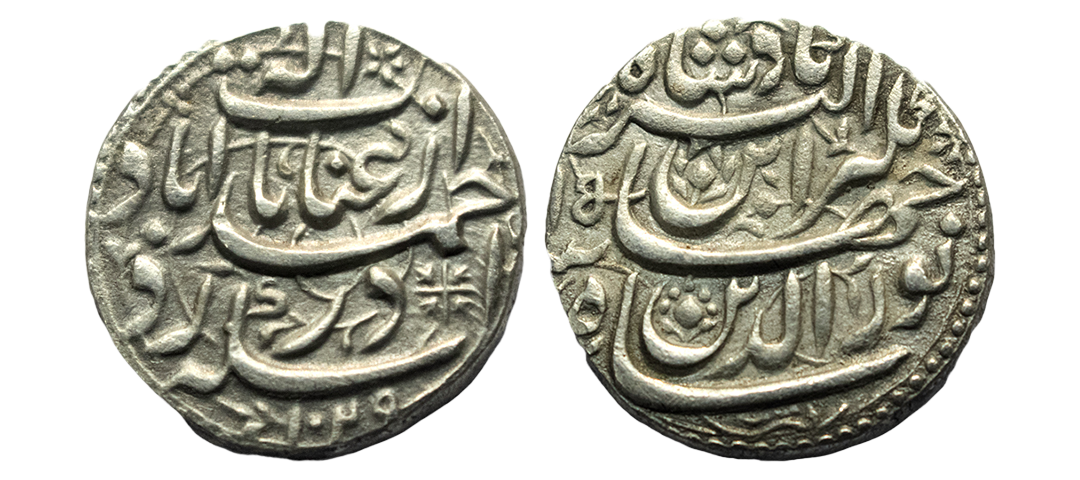 Mughals, Jahangir (1605-1627 AD), silver rupee, Ahmadabad mint, 'Inayat' couplet, AH 1029/RY 15, decorative field on both sides with slight borders visible, KM 149.4, 11.33g. Extremely fine, Very scarce.