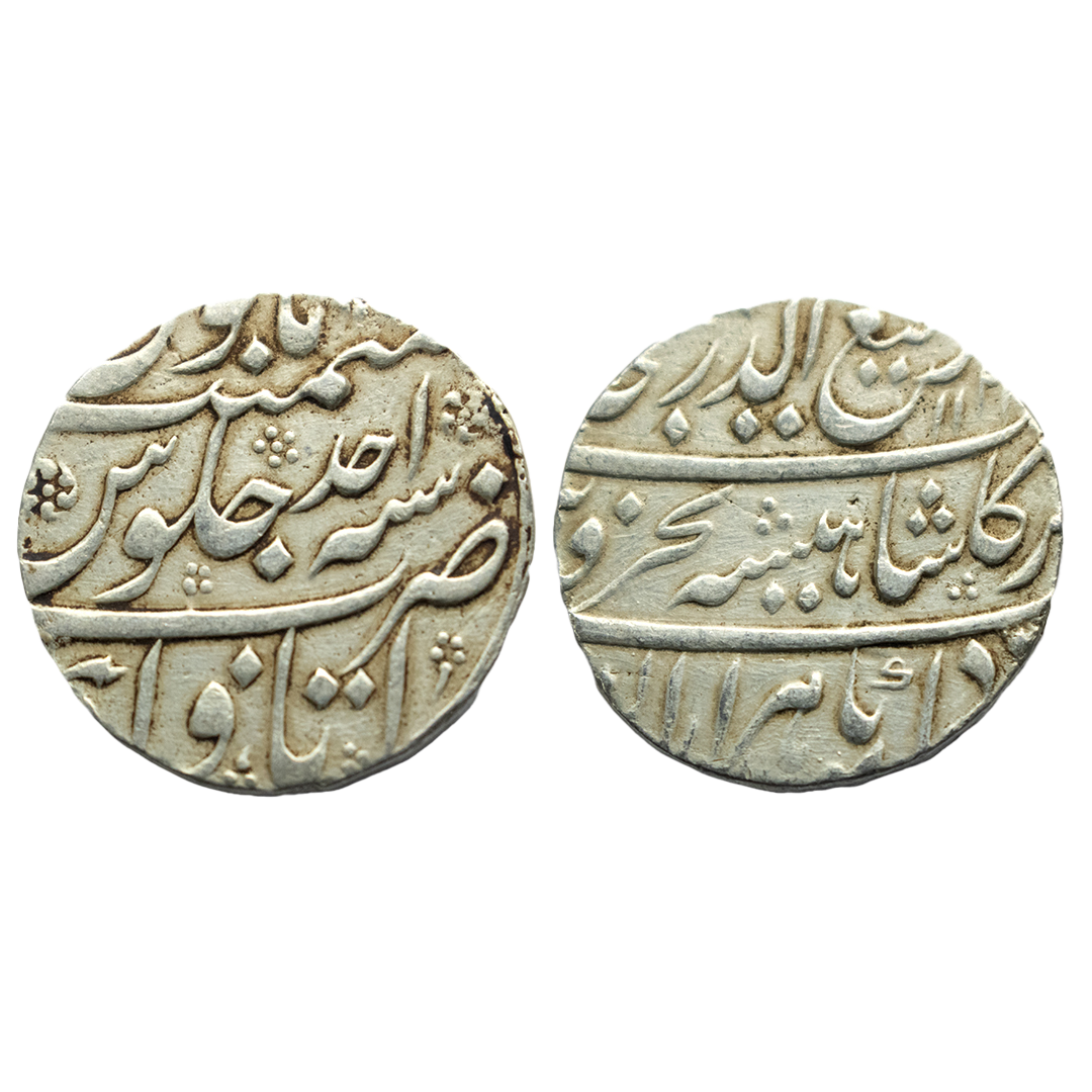 Mughal, Farrukhsiyar, Silver Rupee, 11.44g, Gulshanabad Mint, RY 3 (KM# 377.28). Complete Mint name on bottom of reverse. Very fine, very rare.