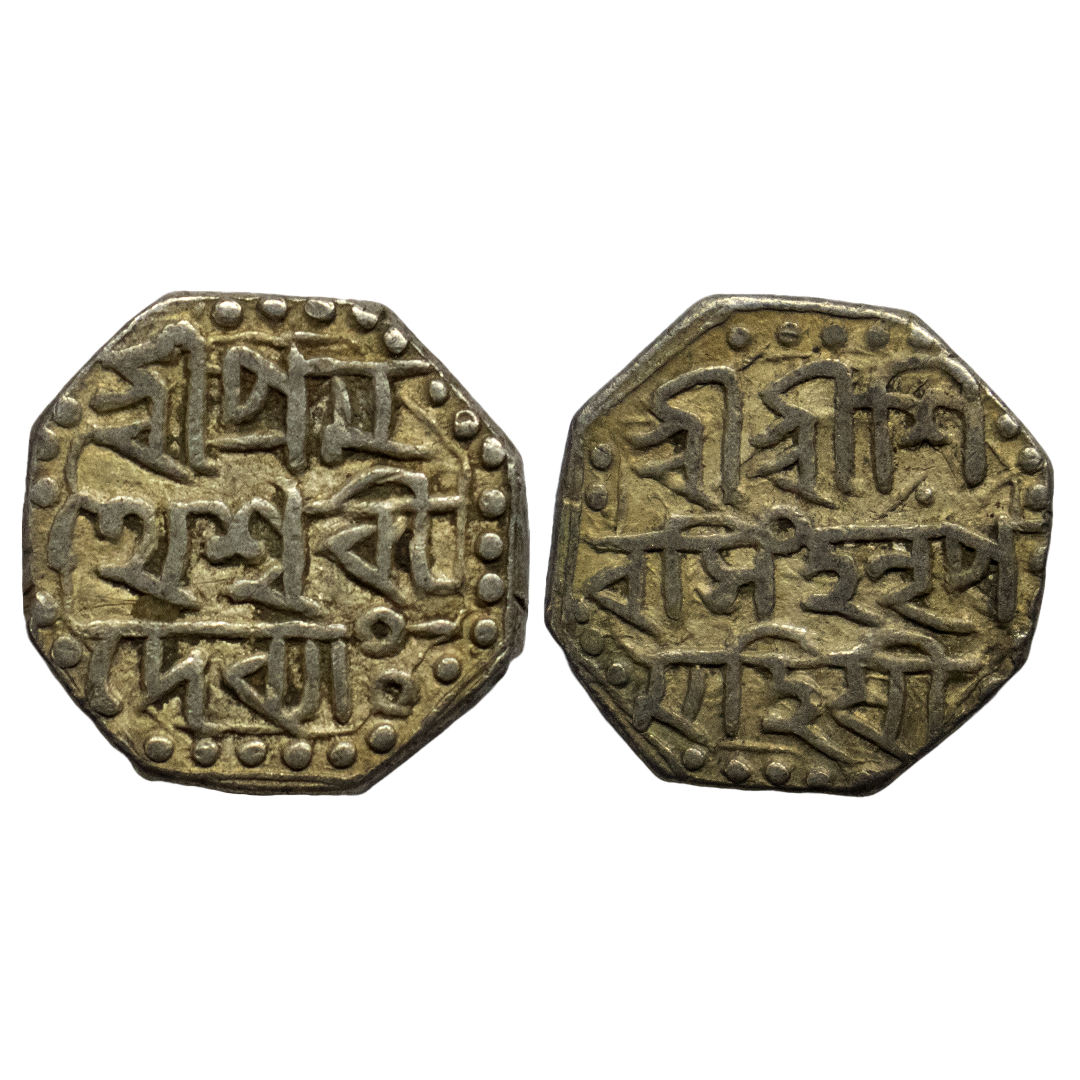 Independent Kingdoms, Assam, Rudra Simha (SE 1618-1636, 1696-1714 AD), Silver Octagonal Rupee, 11.02gms, SE 1623, Assamese legend on both sides within dotted border, Obv: “Sri Sri Ha/ra Gauri Pa/dambuja Madhu/karasya”, Rev: “Sri Srimat/ Svarga deva Rudra/ Simhasya Sa/ke 1623”, Lion below running right, R&B # F9.1, very fine+, rare.