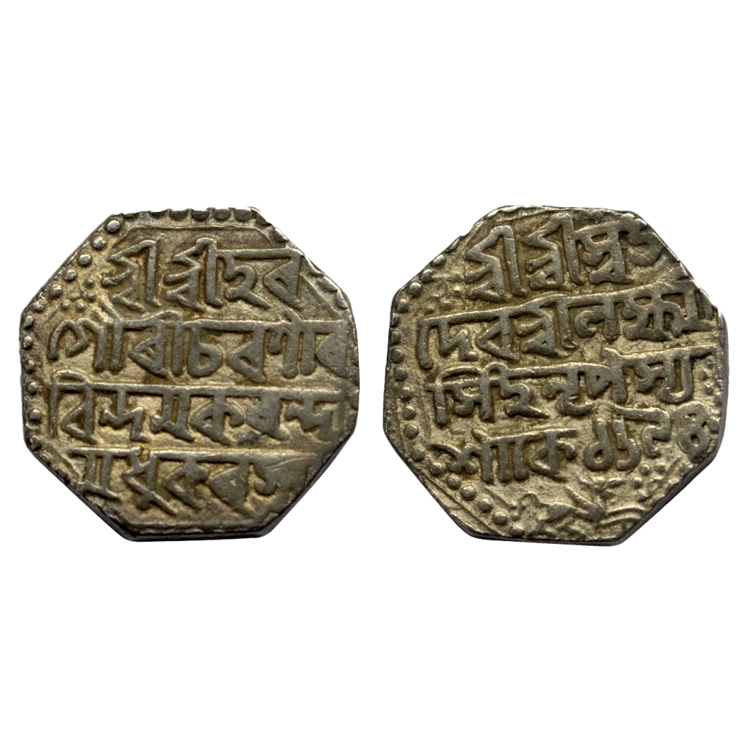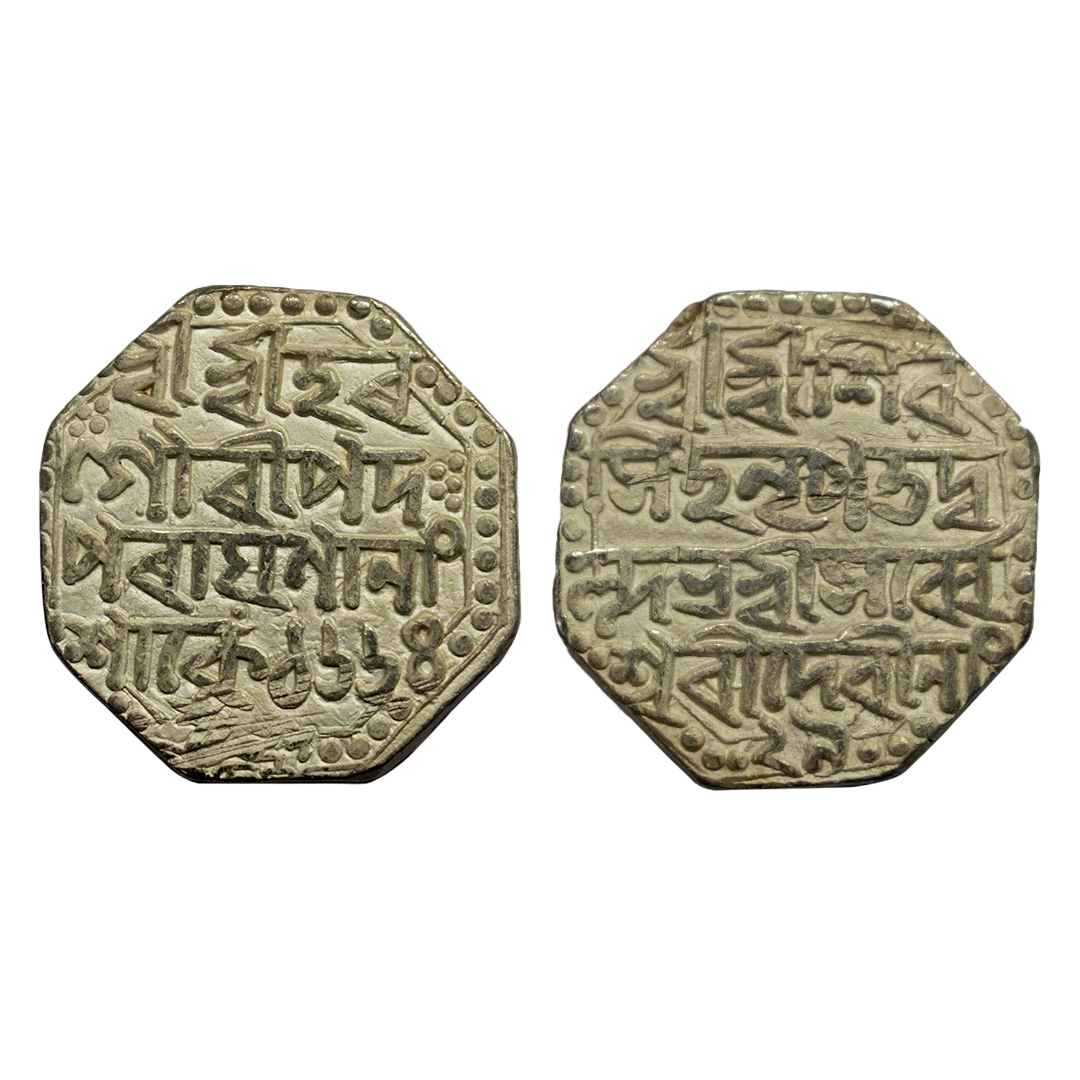 Assam, Siva Simha citing Queen Pramathesvari (SE 1636-1666, 1714-1744 AD), Octagonal Silver Rupee, 11.17 gms, , legends in three lines Obv: “Sri Sri Hara/ Gauri Pada Pa/rayanayah/ Sake 1650”, Lion to right, Rev: “Sri Sri Siva/ Simha Nrpa Mahi/si Sri Pramathesv/ri Devyah”, RB. # I7.1, very fine+, scarce.