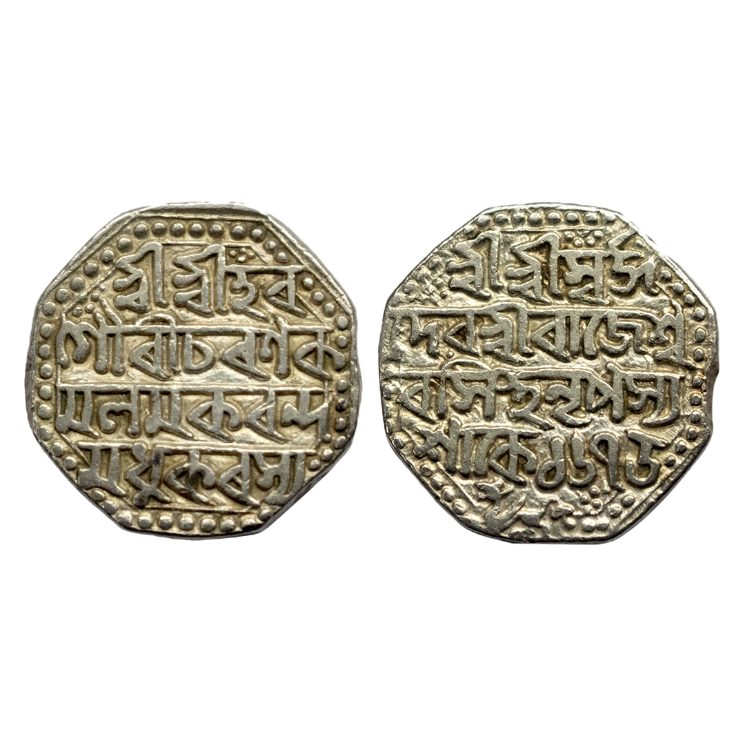 Independent Kingdoms, Assam, Rajeshvara Simha / Siu-rem-pha (SE 1673-1691, 1751-1769 AD), Octagonal Silver Rupee, 11.20 gms, lion to left, SE 1675, RB # O 40.2, very fine, very scarce.