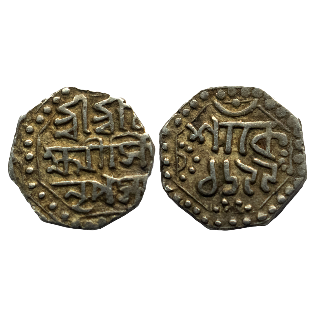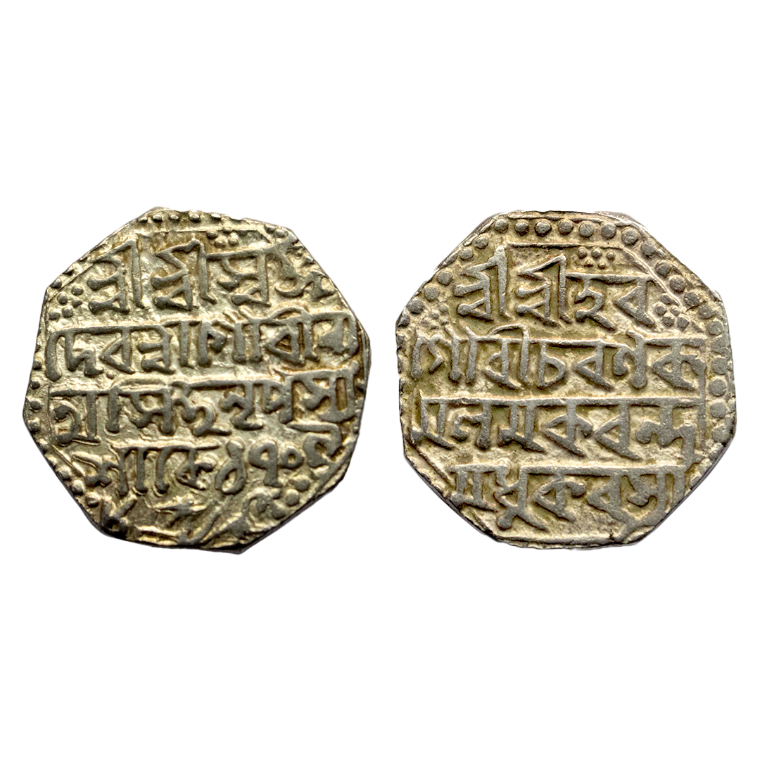 IK, Assam,LakshmiSimha (1770-1780 AD), silver ¼ rupee, Sake 1698, R&B Q55.1, 2.71g. Obv: Legend Sri Sri La/kshmi/Simha/NrPasya in three lines. Rev: Legend sake/1698 in two lines.Good Very fine, Very scarce.