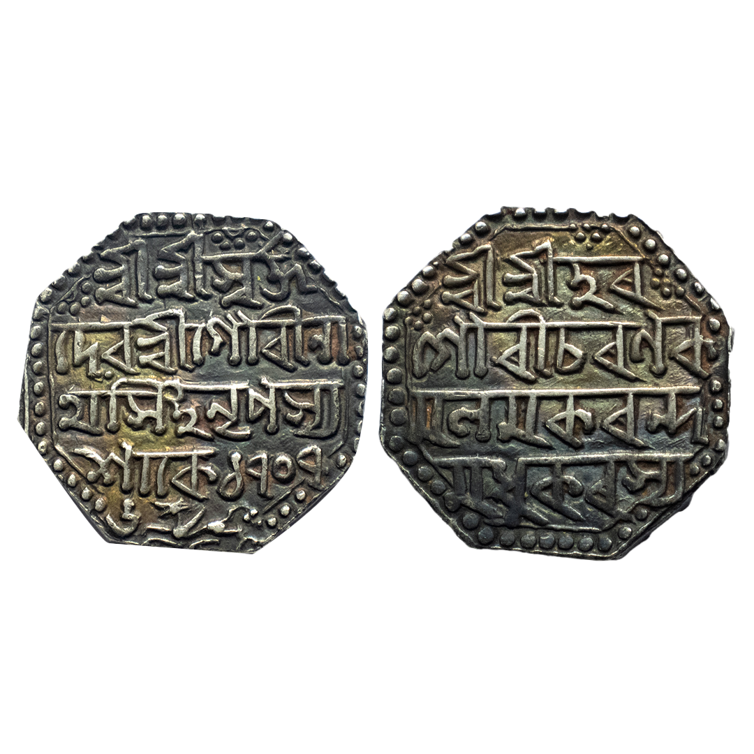 Independent Kingdoms, Assam, Gaurinath Simha (SE 1702-1718, 1780-1796 AD), Octagonal Silver Rupee, 11.37 gms, Saka 1709/8, obv. Sri Sri Hara/Gauri Charana Ka/mala Makaranda/Madhukarasya, rev. Sri Sri Svarga/Deva Gaurina/tha Simha Nrpasya /Sake 1709, winged lion running to left, R&B # R41.3, very fine+, scarce.