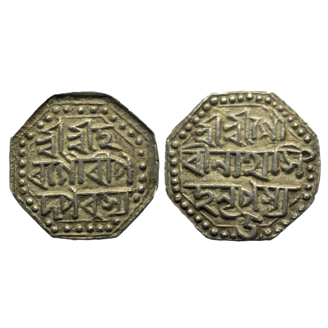 Independent Kingdoms, Assam, Gaurinath Simha (SE 1702-1718, 1780-1796 AD), Octagonal Silver Rupee, 11.37 gms, Saka 1709/8, obv. Sri Sri Hara/Gauri Charana Ka/mala Makaranda/Madhukarasya, rev. Sri Sri Svarga/Deva Gaurina/tha Simha Nrpasya /Sake 1709, winged lion running to left, R&B # R41.3, very fine+, scarce.