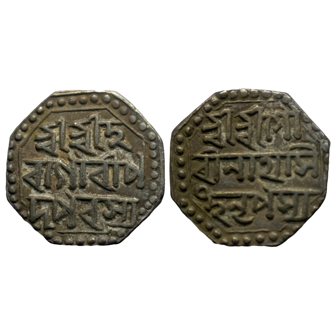Independent Kingdoms, Assam, Gaurinath Simha (SE 1702-1718, 1780-1796 AD), Octagonal Silver Rupee, 11.37 gms, Saka 1709/8, obv. Sri Sri Hara/Gauri Charana Ka/mala Makaranda/Madhukarasya, rev. Sri Sri Svarga/Deva Gaurina/tha Simha Nrpasya /Sake 1709, winged lion running to left, R&B # R41.3, very fine+, scarce.