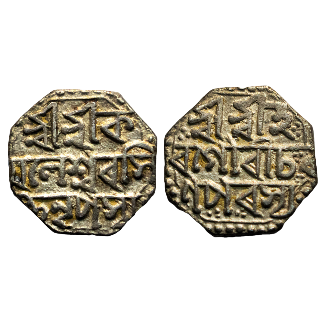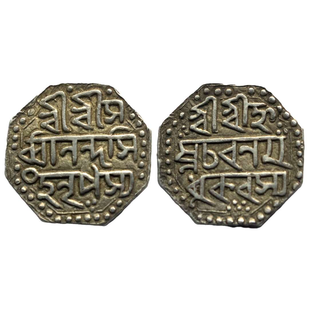 Assam, Gaurinath Simha (1780-1795 AD), silver ½ rupee, ND/RY 5, R&B 70.1-70.5, 5.65g. Obv: Legend Sri Sri Ha/ra Gauri Pa/da Parasya. Rev: Legend Sri Sri Gau/rinatha Sim/ha NrPasya, year 5 in bottom, both side legend in three line. Complete Borders, About Uncirculated, Very scarce.
