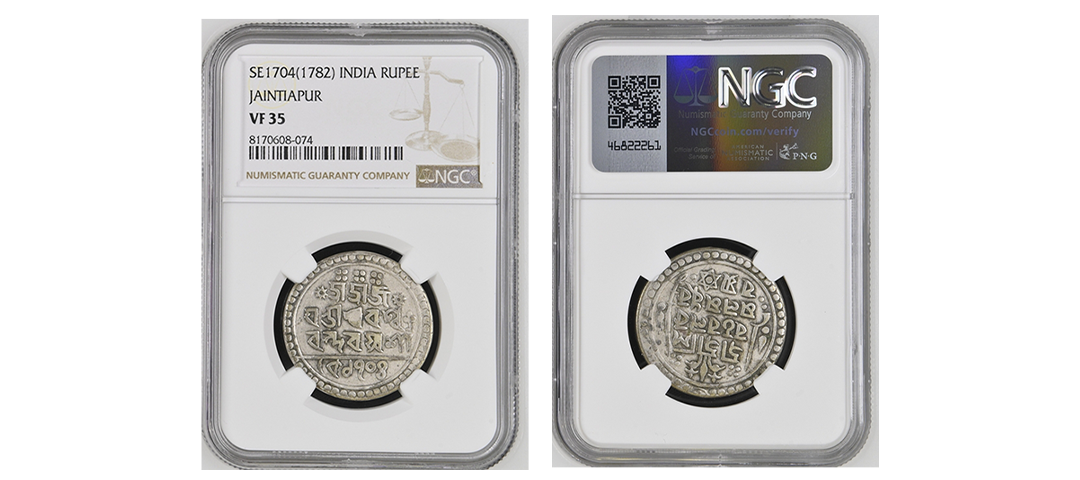 Independent Kingdoms, Cooch Behar, Harendra Narayan or Darendra Narayan (SE 1695-1761, 1773-1839 AD), Silver 1/2 Tanka, 4.81 gms, Obv: sri/sri/siva charana/kamala madhu/karasya, Rev: sri srima/t dharendra or harendra nara/yanasya sake, 4.53g, 18.19mm, S.K.Bose # M-1.10, about very fine.