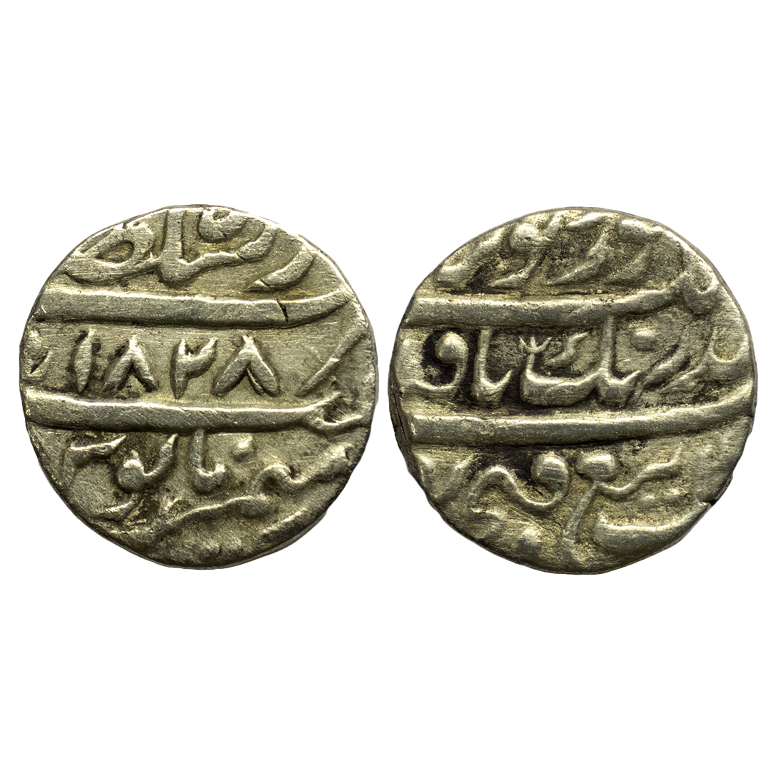 Sikh Empire, Bhangi Misls (1766-1796 AD), silver rupee, Dar us-sultanat Lahore mint, 'Gobind Shahi' couplet, VS 1828, Herrli 08.03.04, 10.65g. Obv: Persian legend deg tegh fath nusrat be darang, yaft az nanak guru gobind singh. Rev: Mint name with epithet at top, RY and Jalus formula. Good Very fine, Very rare date.
