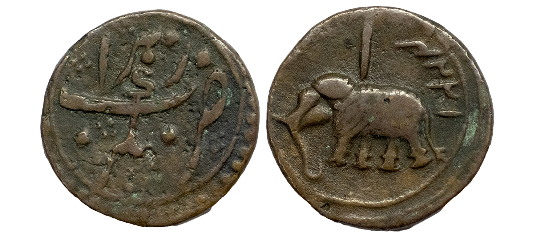 Independent Kingdoms, Mysore, Tipu Sultan (AM 1215-1227, 1787-1799 AD), Copper Paisa, 8.63 gms, Nagar Mint, AM 1224, Obv. Elephant to the left & date, Rev. Zarb Nagar zohra decorated with rosettes, KM # 103.11, very fine+, scarce