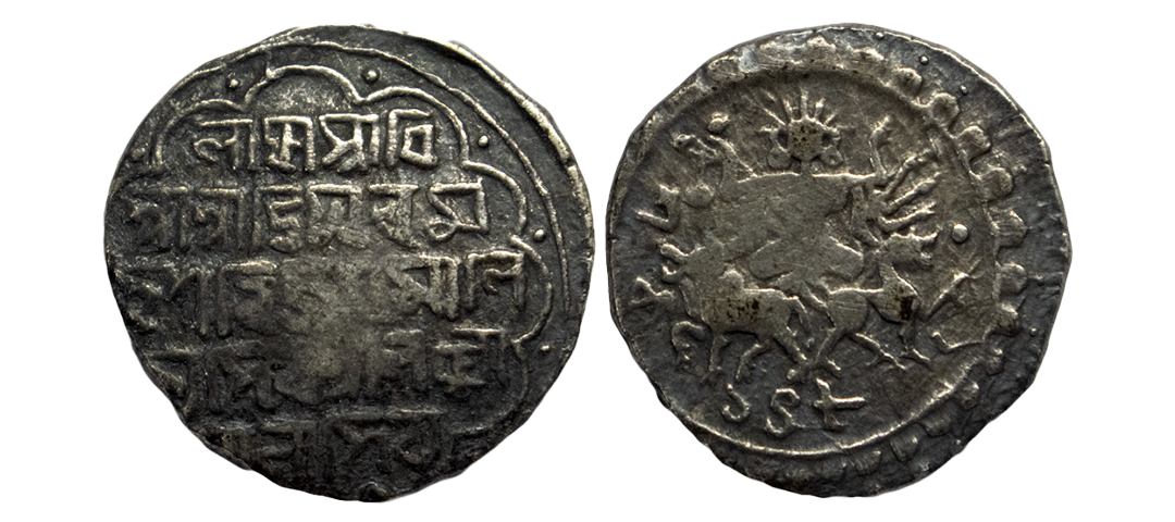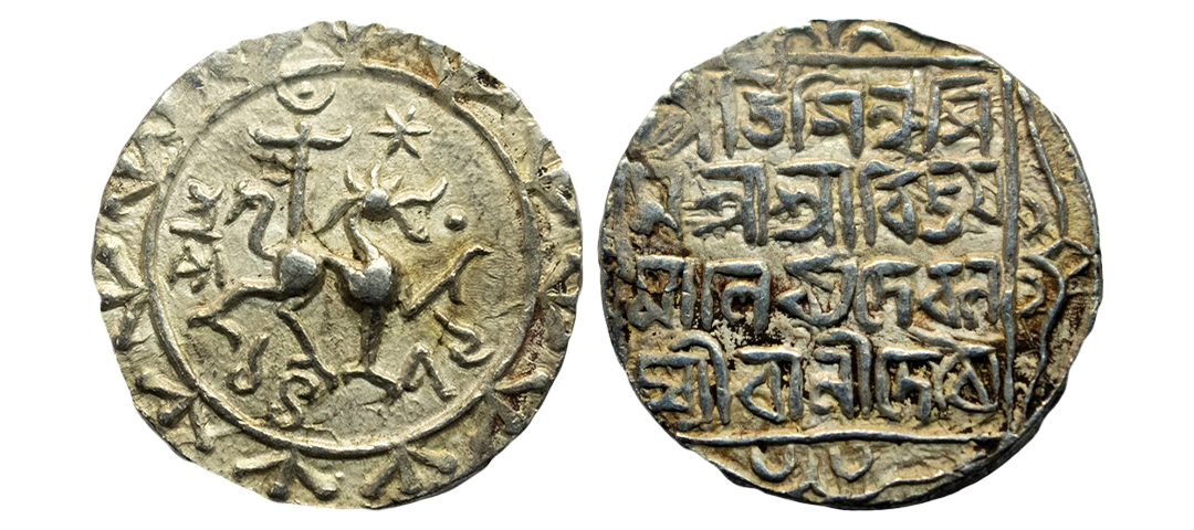 Dhurasara Snayi Type Silver Tanka of Deva Manikya citing Queen Padmavati, 10.65g, Saka 1449, Obverse: Lion facing left, crescent and bead above, two beads by lion's mouth, date below, all within a circle and fin-like border. Reverse: “Dhurasara Sna/yi Tripura Sri/ Sri Deva Mani/kya Padmavatyau” within square and border (R&B 78). Very Fine, Exceedingly Rare