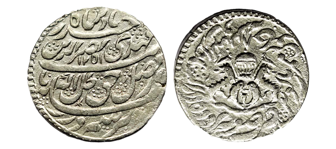 PS, Awadh, Nasir ud-din Haidar (AH 1243-1253 / 1827-1837 AD), Suba Awadh Dar-us-Sultanat Lakhnau Mint, Silver Rupee, 1250/7 RY, "Fazle Haq zille Elah" couplet, Obv: Persian legend "sikka zad bar seem wa zar az fazle haque zille elah, nayeb-e-mehdi Naseer-ud-din Haidar Badshah" with Hijri year, Rev: crown flanked by rampant lions holding a flag, two upright fish below, Persian legend "zarb Suba Awadh sanah julus, manus maimanat dar-us-sultana",(KM # 205.3,/ MK# 8.39), Very Fine+, Very Rare, Nazrana Flan with borders on both sides, struck with ¼ rupee die.